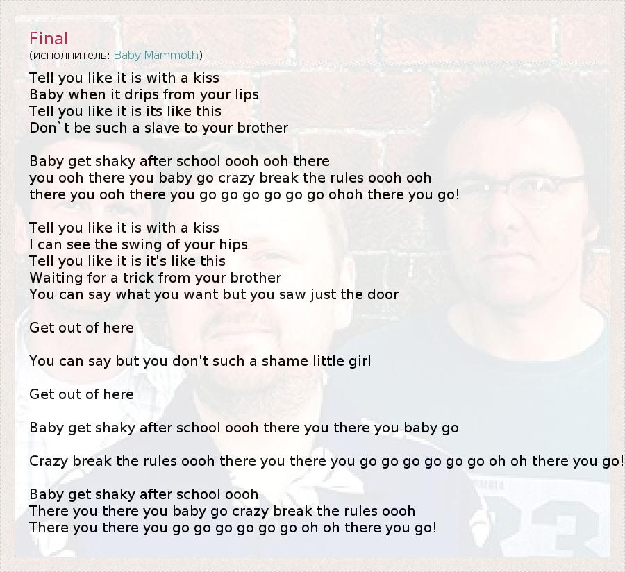Tell you like it is with a kiss Baby when it drips from your lips Tell you like it is its like this Don`t be such a slave to your brother Baby get shaky after school oooh ooh there you ooh there you baby go crazy break the rules oooh ooh there you ooh there you go go go go go go ohoh there you go! Tell you like it is with a kiss I can see the swing of your hips Tell you like it is it's like this Waiting for a trick from your brother You can say what you want but you saw just the door Get out of here You can say but you don't such a shame little girl Get out of here Baby get shaky after school oooh there you there you baby go Crazy break the rules oooh there you there you go go go go go go oh oh there you go! Baby get shaky after school oooh There you there you baby go crazy break the rules oooh There you there you go go go go go go oh oh there you go!