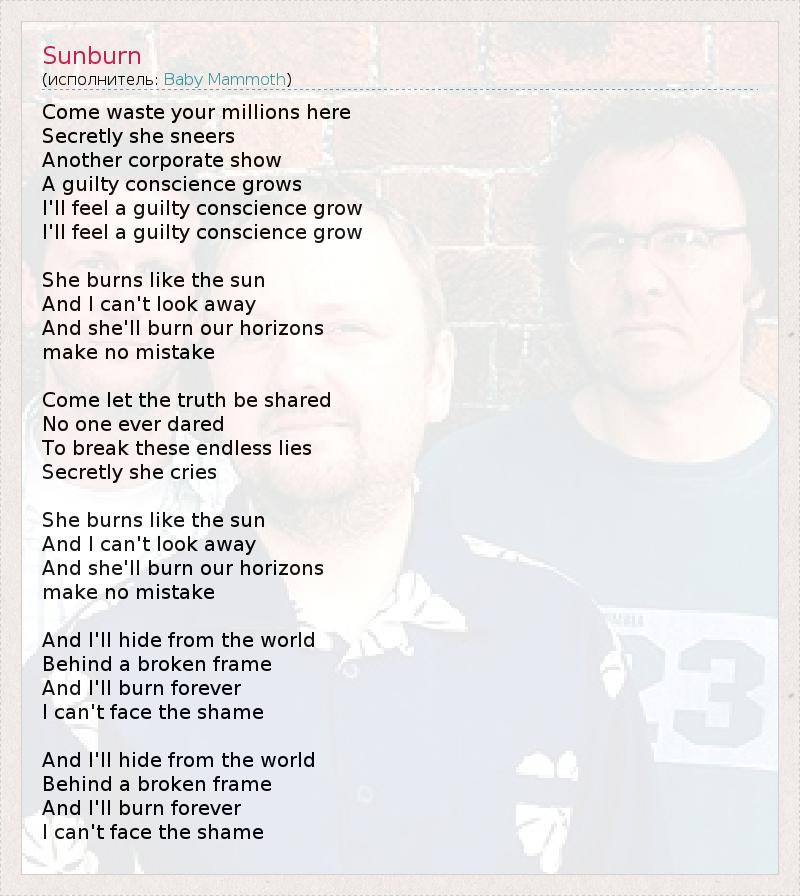 Давай, потрать здесь на ветер свои миллионы. Она тайком усмехается. Еще одно корпоративное шоу, Просыпается виноватая совесть. Я почувствую, как просыпается виноватая совесть. Я почувствую, как просыпается виноватая совесть. Она горит, как солнце, И я не могу оторвать от нее взгляда. Она спалит наши горизонты, Не сомневайтесь. Давай, поделись правдой. Никто и никогда не смел Положить конец этой бесконечной лжи. Она тайком плачет. Она горит, как солнце, И я не могу оторвать от нее взгляда. Она спалит наши горизонты, Не сомневайтесь. И я спрячусь от мира За сломанной рамкой. И буду гореть вечно, Я не могу принять позор. И я спрячусь от мира За сломанной рамкой. И буду гореть вечно, Я не могу принять позор.