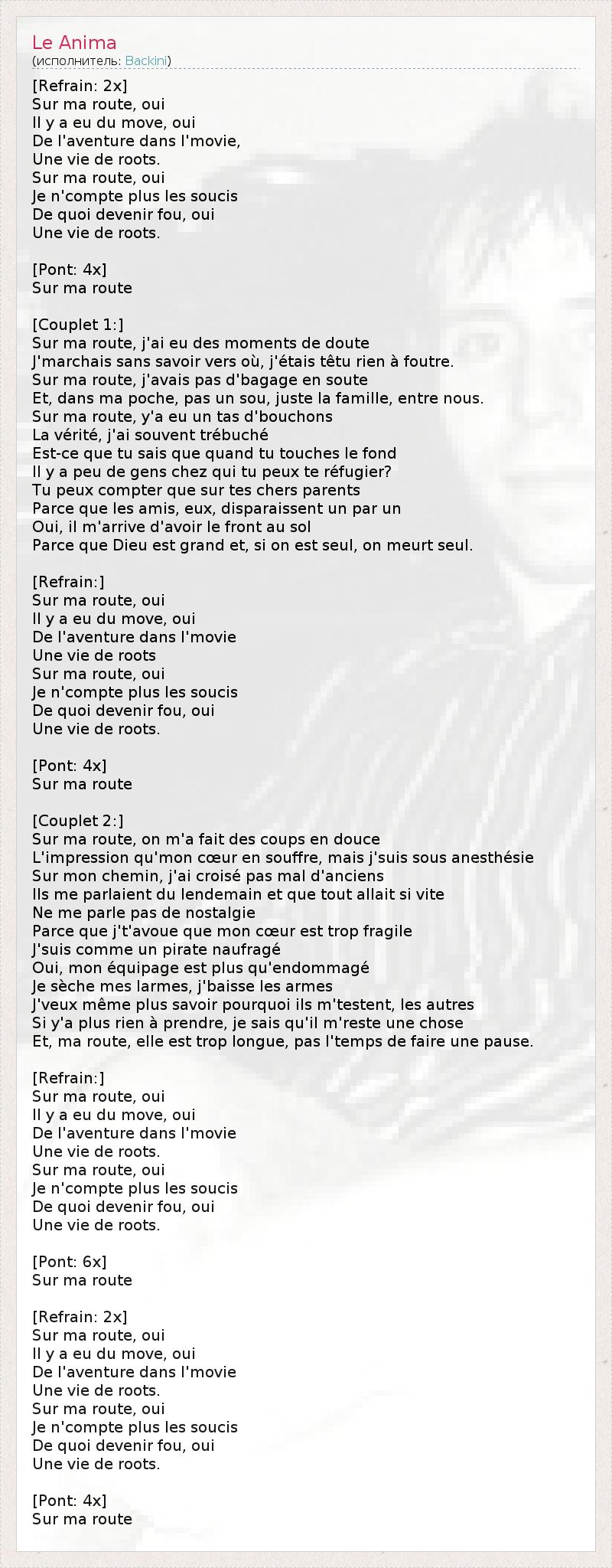 1 - *,** Une vie de route - имеется в виду жизнь, когда у тебя есть только предметы первой необходимости.