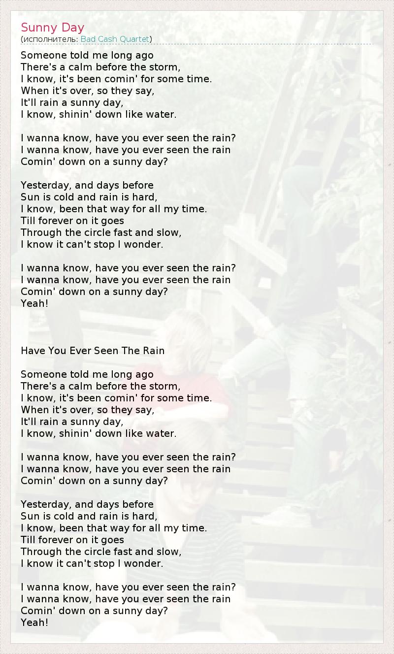 Someone told me long ago There's a calm before the storm, I know, it's been comin' for some time. When it's over, so they say, It'll rain a sunny day, I know, shinin' down like water. I wanna know, have you ever seen the rain? I wanna know, have you ever seen the rain Comin' down on a sunny day? Yesterday, and days before Sun is cold and rain is hard, I know, been that way for all my time. Till forever on it goes Through the circle fast and slow, I know it can't stop I wonder. I wanna know, have you ever seen the rain? I wanna know, have you ever seen the rain Comin' down on a sunny day? Yeah! Have You Ever Seen The Rain Someone told me long ago There's a calm before the storm, I know, it's been comin' for some time. When it's over, so they say, It'll rain a sunny day, I know, shinin' down like water. I wanna know, have you ever seen the rain? I wanna know, have you ever seen the rain Comin' down on a sunny day? Yesterday, and days before Sun is cold and rain is hard, I know, been that way for all my time. Till forever on it goes Through the circle fast and slow, I know it can't stop I wonder. I wanna know, have you ever seen the rain? I wanna know, have you ever seen the rain Comin' down on a sunny day? Yeah!