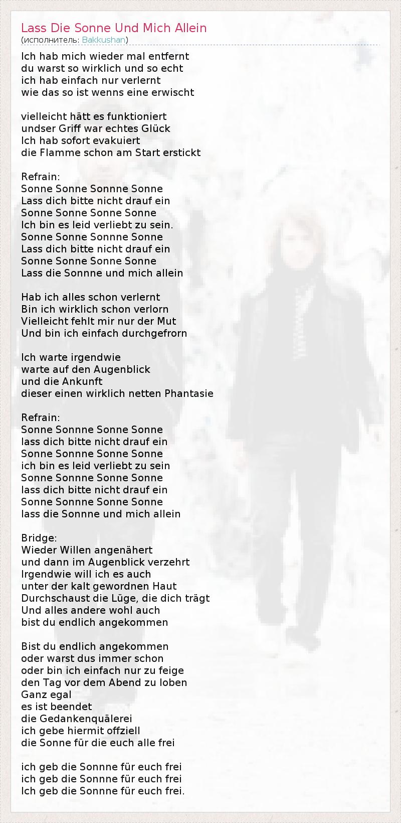 Я снова удалены Вы были так реально и так подлинной Я только забыл, как как так Wenns поймали может быть, это было бы работать undser сцепление было подлинным счастьем Я сразу же эвакуированы душит право пламени в начале Припев: Солнце Солнце Солнце Sonnne Пожалуйста, не дайте ему Солнце Солнце Солнце Солнце Мне очень жаль , что так влюблен . Солнце Солнце Солнце Sonnne Пожалуйста, не дайте ему Солнце Солнце Солнце Солнце Пусть Sonnne и меня в покое Я уже все забыл Неужели я уже verlorn Может быть, мне не хватает только смелости И я просто durchgefrorn Жду как-то ждет момента и прибытие это действительно хороший фантазия Припев: Солнце Солнце Солнце Sonnne Пожалуйста, не позволяйте себе быть это Солнце Солнце Солнце Sonnne Мне очень жаль , что так в любви Солнце Солнце Солнце Sonnne Пожалуйста, не позволяйте себе быть это Солнце Солнце Солнце Sonnne пусть Sonnne и меня в покое мост : Приближенных воля восстановления и затем потребляется в момент Как-то я хочу его также под холодным кожи gewordnen По Schaustлжи , которая несет вас А все остальное , вероятно, вы , наконец, прибыл Вы , наконец, прибыл или режим всегда были или я просто слишком трусливы хвалить за день до вечера неважно она будет закончена мысли жестокости Настоящим я официально солнце для вас , все бесплатно Отдам Sonnne для вас бесплатно Отдам Sonnne для вас бесплатно Я дамSonnne бесплатно для вас .