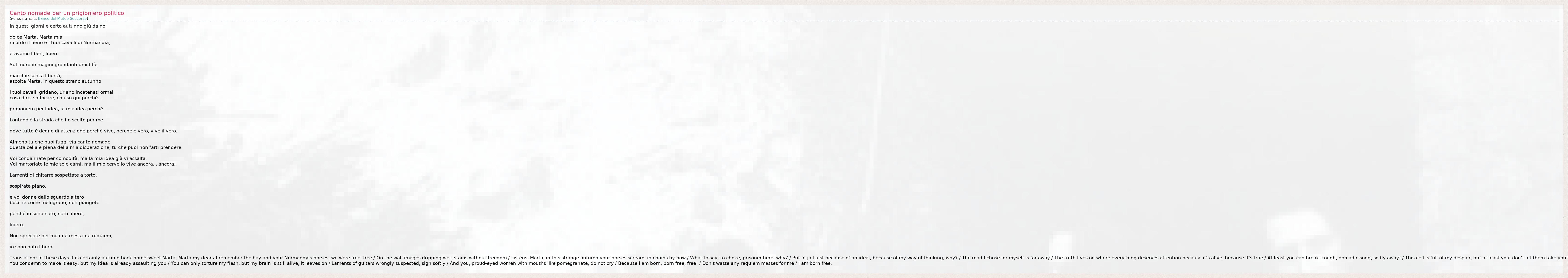 In questi giorni è certo autunno giù da noi dolce Marta, Marta mia ricordo il fieno e i tuoi cavalli di Normandia, eravamo liberi, liberi. Sul muro immagini grondanti umidità, macchie senza libertà, ascolta Marta, in questo strano autunno i tuoi cavalli gridano, urlano incatenati ormai cosa dire, soffocare, chiuso qui perché... prigioniero per l'idea, la mia idea perché. Lontano è la strada che ho scelto per me dove tutto è degno di attenzione perché vive, perché è vero, vive il vero. Almeno tu che puoi fuggi via canto nomade questa cella è piena della mia disperazione, tu che puoi non farti prendere. Voi condannate per comodità, ma la mia idea già vi assalta. Voi martoriate le mie sole carni, ma il mio cervello vive ancora... ancora. Lamenti di chitarre sospettate a torto, sospirate piano, e voi donne dallo sguardo altero bocche come melograno, non piangete perché io sono nato, nato libero, libero. Non sprecate per me una messa da requiem, io sono nato libero. Translation: In these days it is certainly autumn back home sweet Marta, Marta my dear / I remember the hay and your Normandy's horses, we were free, free / On the wall images dripping wet, stains without freedom / Listens, Marta, in this strange autumn your horses scream, in chains by now / What to say, to choke, prisoner here, why? / Put in jail just because of an ideal, because of my way of thinking, why? / The road I chose for myself is far away / The truth lives on where everything deserves attention because it's alive, because it's true / At least you can break trough, nomadic song, so fly away! / This cell is full of my despair, but at least you, don't let them take you! You condemn to make it easy, but my idea is already assaulting you / You can only torture my flesh, but my brain is still alive, it leaves on / Laments of guitars wrongly suspected, sigh softly / And you, proud-eyed women with mouths like pomegranate, do not cry / Because I am born, born free, free! / Don't waste any requiem masses for me / I am born free.