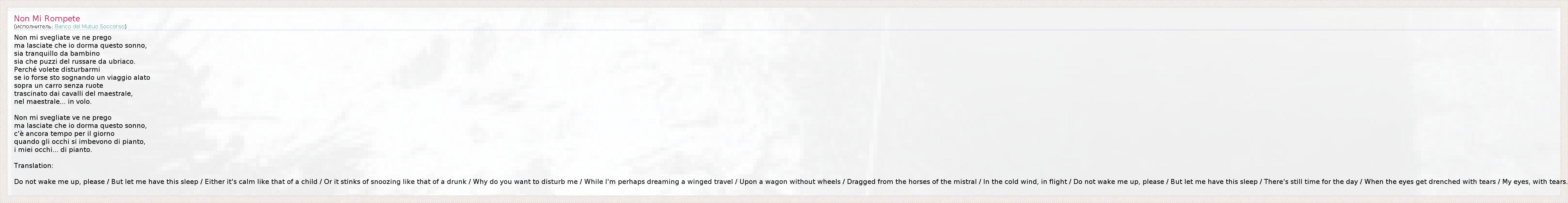 Non mi svegliate ve ne prego ma lasciate che io dorma questo sonno, sia tranquillo da bambino sia che puzzi del russare da ubriaco. Perché volete disturbarmi se io forse sto sognando un viaggio alato sopra un carro senza ruote trascinato dai cavalli del maestrale, nel maestrale... in volo. Non mi svegliate ve ne prego ma lasciate che io dorma questo sonno, c'è ancora tempo per il giorno quando gli occhi si imbevono di pianto, i miei occhi... di pianto. Translation: Do not wake me up, please / But let me have this sleep / Either it's calm like that of a child / Or it stinks of snoozing like that of a drunk / Why do you want to disturb me / While I'm perhaps dreaming a winged travel / Upon a wagon without wheels / Dragged from the horses of the mistral / In the cold wind, in flight / Do not wake me up, please / But let me have this sleep / There's still time for the day / When the eyes get drenched with tears / My eyes, with tears.