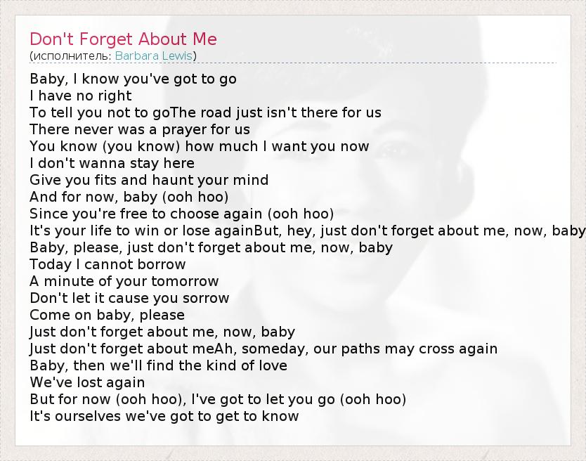 Baby, I know you've got to go I have no right To tell you not to goThe road just isn't there for us There never was a prayer for us You know (you know) how much I want you now I don't wanna stay here Give you fits and haunt your mind And for now, baby (ooh hoo) Since you're free to choose again (ooh hoo) It's your life to win or lose againBut, hey, just don't forget about me, now, baby Baby, please, just don't forget about me, now, baby Today I cannot borrow A minute of your tomorrow Don't let it cause you sorrow Come on baby, please Just don't forget about me, now, baby Just don't forget about meAh, someday, our paths may cross again Baby, then we'll find the kind of love We've lost again But for now (ooh hoo), I've got to let you go (ooh hoo) It's ourselves we've got to get to know