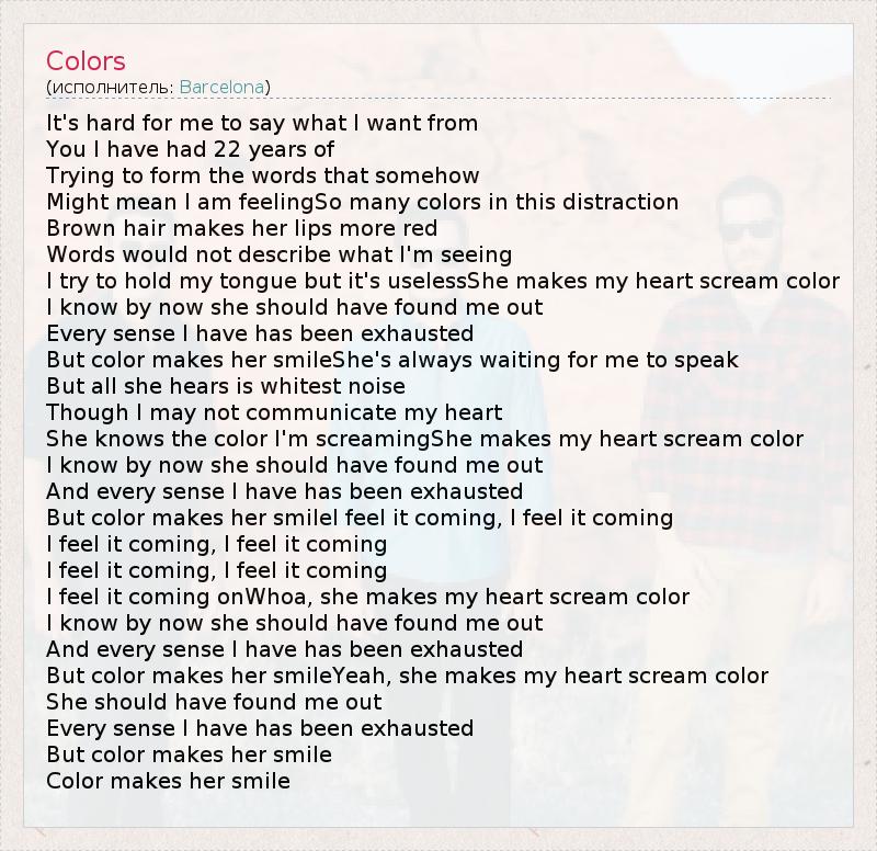 It's hard for me to say what I want from You I have had 22 years of Trying to form the words that somehow Might mean I am feelingSo many colors in this distraction Brown hair makes her lips more red Words would not describe what I'm seeing I try to hold my tongue but it's uselessShe makes my heart scream color I know by now she should have found me out Every sense I have has been exhausted But color makes her smileShe's always waiting for me to speak But all she hears is whitest noise Though I may not communicate my heart She knows the color I'm screamingShe makes my heart scream color I know by now she should have found me out And every sense I have has been exhausted But color makes her smileI feel it coming, I feel it coming I feel it coming, I feel it coming I feel it coming, I feel it coming I feel it coming onWhoa, she makes my heart scream color I know by now she should have found me out And every sense I have has been exhausted But color makes her smileYeah, she makes my heart scream color She should have found me out Every sense I have has been exhausted But color makes her smile Color makes her smile