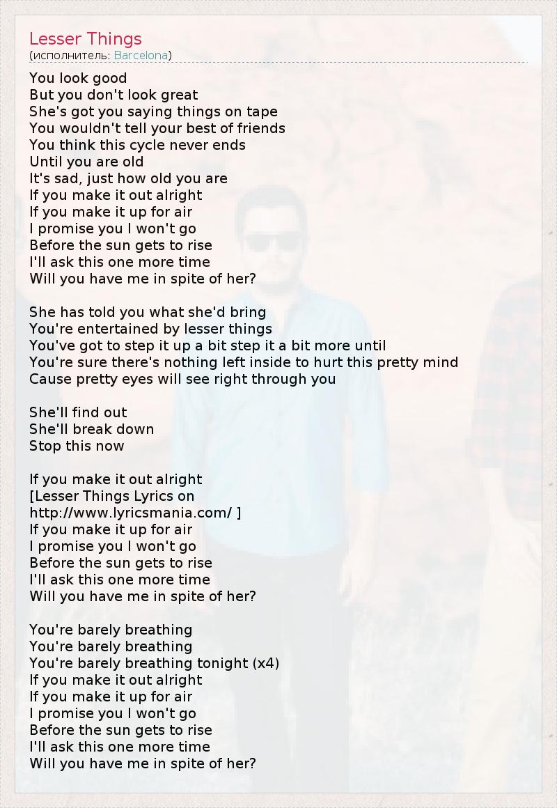 You look good But you don't look great She's got you saying things on tape You wouldn't tell your best of friends You think this cycle never ends Until you are old It's sad, just how old you are If you make it out alright If you make it up for air I promise you I won't go Before the sun gets to rise I'll ask this one more time Will you have me in spite of her? She has told you what she'd bring You're entertained by lesser things You've got to step it up a bit step it a bit more until You're sure there's nothing left inside to hurt this pretty mind Cause pretty eyes will see right through you She'll find out She'll break down Stop this now If you make it out alright [Lesser Things Lyrics on http://www.lyricsmania.com/ ] If you make it up for air I promise you I won't go Before the sun gets to rise I'll ask this one more time Will you have me in spite of her? You're barely breathing You're barely breathing You're barely breathing tonight (x4) If you make it out alright If you make it up for air I promise you I won't go Before the sun gets to rise I'll ask this one more time Will you have me in spite of her?