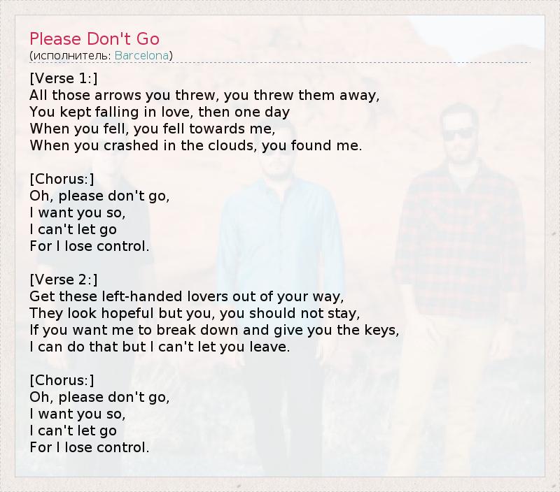 [Verse 1:] All those arrows you threw, you threw them away, You kept falling in love, then one day When you fell, you fell towards me, When you crashed in the clouds, you found me. [Chorus:] Oh, please don't go, I want you so, I can't let go For I lose control. [Verse 2:] Get these left-handed lovers out of your way, They look hopeful but you, you should not stay, If you want me to break down and give you the keys, I can do that but I can't let you leave. [Chorus:] Oh, please don't go, I want you so, I can't let go For I lose control.