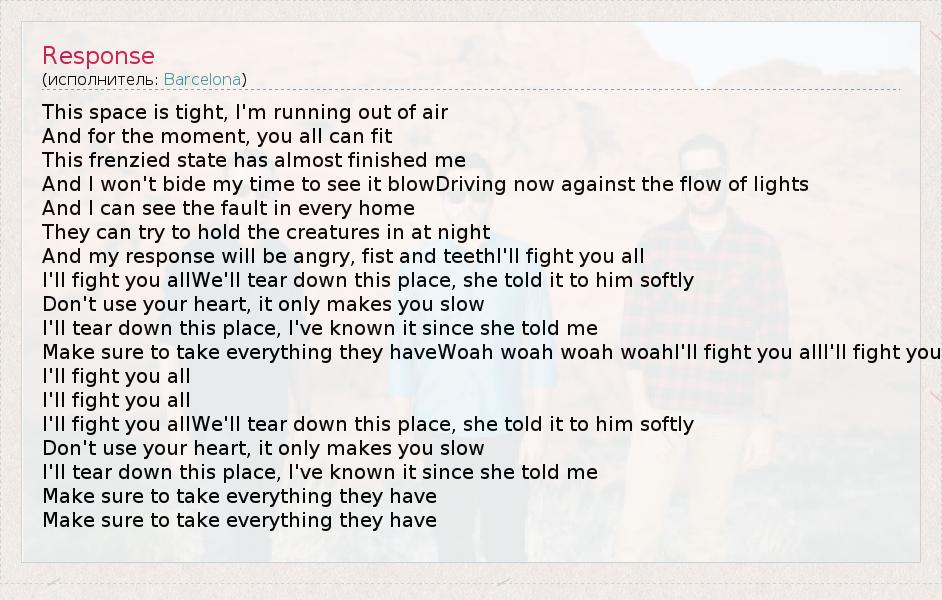 This space is tight, I'm running out of air And for the moment, you all can fit This frenzied state has almost finished me And I won't bide my time to see it blowDriving now against the flow of lights And I can see the fault in every home They can try to hold the creatures in at night And my response will be angry, fist and teethI'll fight you all I'll fight you allWe'll tear down this place, she told it to him softly Don't use your heart, it only makes you slow I'll tear down this place, I've known it since she told me Make sure to take everything they haveWoah woah woah woahI'll fight you allI'll fight you I'll fight you all I'll fight you all I'll fight you allWe'll tear down this place, she told it to him softly Don't use your heart, it only makes you slow I'll tear down this place, I've known it since she told me Make sure to take everything they have Make sure to take everything they have