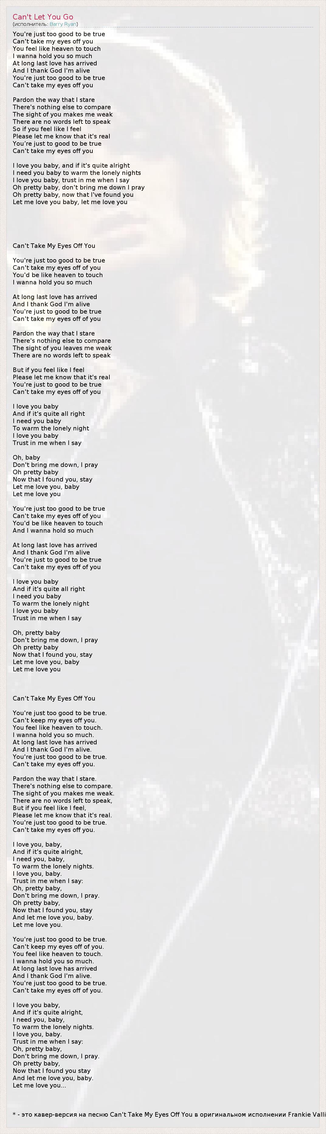 You're just too good to be true Can't take my eyes off you You feel like heaven to touch I wanna hold you so much At long last love has arrived And I thank God I'm alive You're just too good to be true Can't take my eyes off you Pardon the way that I stare There's nothing else to compare The sight of you makes me weak There are no words left to speak So if you feel like I feel Please let me know that it's real You’re just to good to be true Can't take my eyes off you I love you baby, and if it's quite alright I need you baby to warm the lonely nights I love you baby, trust in me when I say Oh pretty baby, don't bring me down I pray Oh pretty baby, now that I've found you Let me love you baby, let me love you Can't Take My Eyes Off You You're just too good to be true Can't take my eyes off of you You'd be like heaven to touch I wanna hold you so much At long last love has arrived And I thank God I'm alive You're just to good to be true Can't take my eyes off of you Pardon the way that I stare There's nothing else to compare The sight of you leaves me weak There are no words left to speak But if you feel like I feel Please let me know that it's real You're just to good to be true Can't take my eyes off of you I love you baby And if it's quite all right I need you baby To warm the lonely night I love you baby Trust in me when I say Oh, baby Don't bring me down, I pray Oh pretty baby Now that I found you, stay Let me love you, baby Let me love you You're just too good to be true Can't take my eyes off of you You'd be like heaven to touch And I wanna hold so much At long last love has arrived And I thank God I'm alive You're just to good to be true Can't take my eyes off of you I love you baby And if it's quite all right I need you baby To warm the lonely night I love you baby Trust in me when I say Oh, pretty baby Don't bring me down, I pray Oh pretty baby Now that I found you, stay Let me love you, baby Let me love you Can't Take My Eyes Off You You're just too good to be true. Can't keep my eyes off you. You feel like heaven to touch. I wanna hold you so much. At long last love has arrived And I thank God I'm alive. You're just too good to be true. Can't take my eyes off you. Pardon the way that I stare. There's nothing else to compare. The sight of you makes me weak. There are no words left to speak, But if you feel like I feel, Please let me know that it's real. You're just too good to be true. Can't take my eyes off you. I love you, baby, And if it's quite alright, I need you, baby, To warm the lonely nights. I love you, baby. Trust in me when I say: Oh, pretty baby, Don't bring me down, I pray. Oh pretty baby, Now that I found you, stay And let me love you, baby. Let me love you. You're just too good to be true. Can't keep my eyes off of you. You feel like heaven to touch. I wanna hold you so much. At long last love has arrived And I thank God I'm alive. You're just too good to be true. Can't take my eyes off of you. I love you baby, And if it's quite alright, I need you, baby, To warm the lonely nights. I love you, baby. Trust in me when I say: Oh, pretty baby, Don't bring me down, I pray. Oh pretty baby, Now that I found you stay And let me love you, baby. Let me love you... * - это кавер-версия на песню Can't Take My Eyes Off You в оригинальном исполнении Frankie Valli