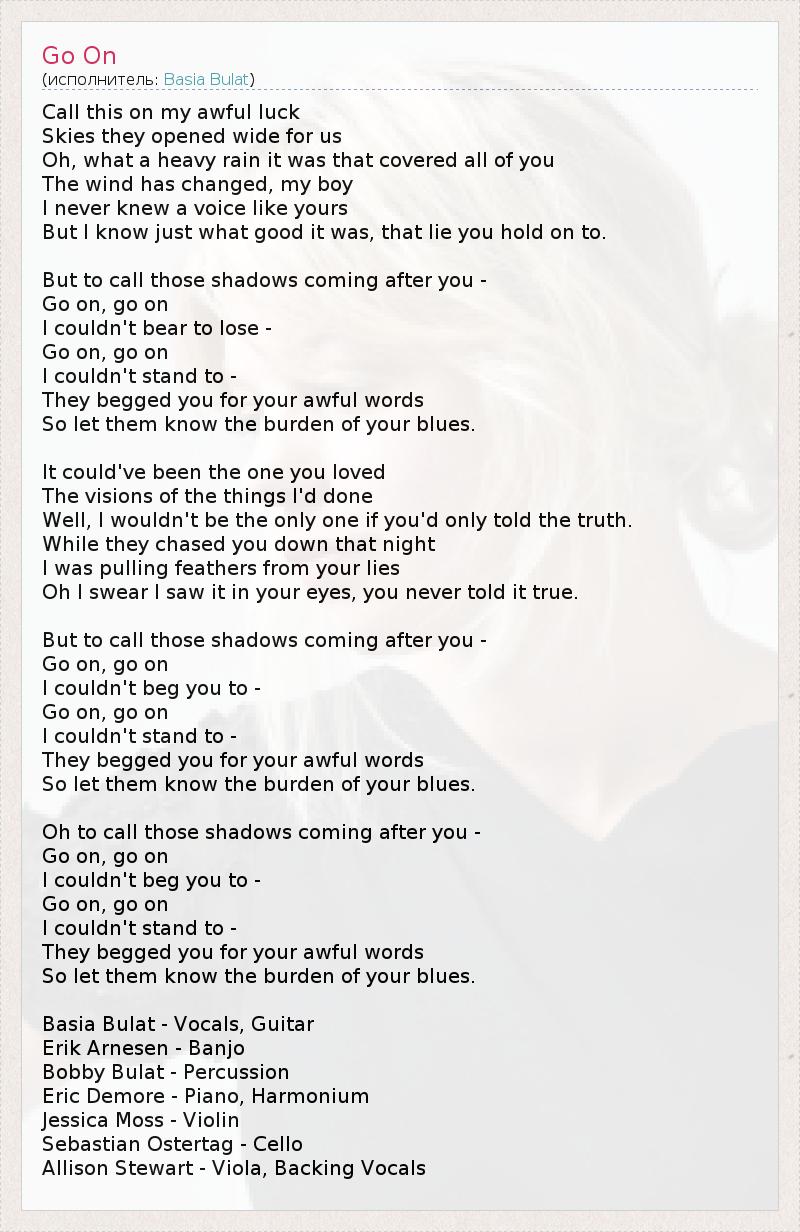 Call this on my awful luck Skies they opened wide for us Oh, what a heavy rain it was that covered all of you The wind has changed, my boy I never knew a voice like yours But I know just what good it was, that lie you hold on to. But to call those shadows coming after you - Go on, go on I couldn't bear to lose - Go on, go on I couldn't stand to - They begged you for your awful words So let them know the burden of your blues. It could've been the one you loved The visions of the things I'd done Well, I wouldn't be the only one if you'd only told the truth. While they chased you down that night I was pulling feathers from your lies Oh I swear I saw it in your eyes, you never told it true. But to call those shadows coming after you - Go on, go on I couldn't beg you to - Go on, go on I couldn't stand to - They begged you for your awful words So let them know the burden of your blues. Oh to call those shadows coming after you - Go on, go on I couldn't beg you to - Go on, go on I couldn't stand to - They begged you for your awful words So let them know the burden of your blues. Basia Bulat - Vocals, Guitar Erik Arnesen - Banjo Bobby Bulat - Percussion Eric Demore - Piano, Harmonium Jessica Moss - Violin Sebastian Ostertag - Cello Allison Stewart - Viola, Backing Vocals
