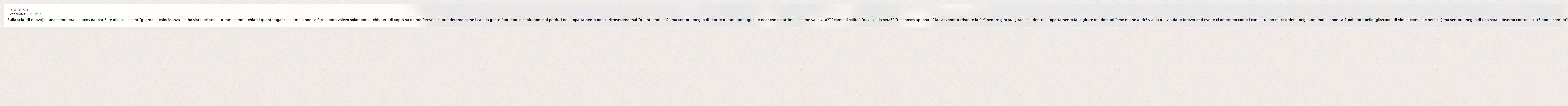 Sulla scia (di nuovo) di una cameriera... stacca dal bar ?lite alle sei la sera "guarda la coincidenza... ti ho vista ieri sera... dimmi come ti chiami quanti ragazzi chiami io non so fare niente volevo solamente... chiuderti di sopra su da me forever" ci prenderemo come i cani la gente fuori non lo capirebbe mai perduti nell'appartamento non ci ritroveremo mai "quanti anni hai?" ma sempre meglio di morire di tanti anni uguali e neanche un attimo... "come va la vita?" "come di solito" "dove vai la sera?" "ti conosco appena..." la canzonetta triste te la far? sentire gira sul giradischi dentro l'appartamento falla girare ora domani forse me ne andr? via da qui via da te forever and ever e ci ameremo come i cani e tu non mi ricorderai negli anni mai... e non sar? poi tanto bello (glissando di violini come al cinema...) ma sempre meglio di una sera d'inverno contro la citt? non ti sembra?
