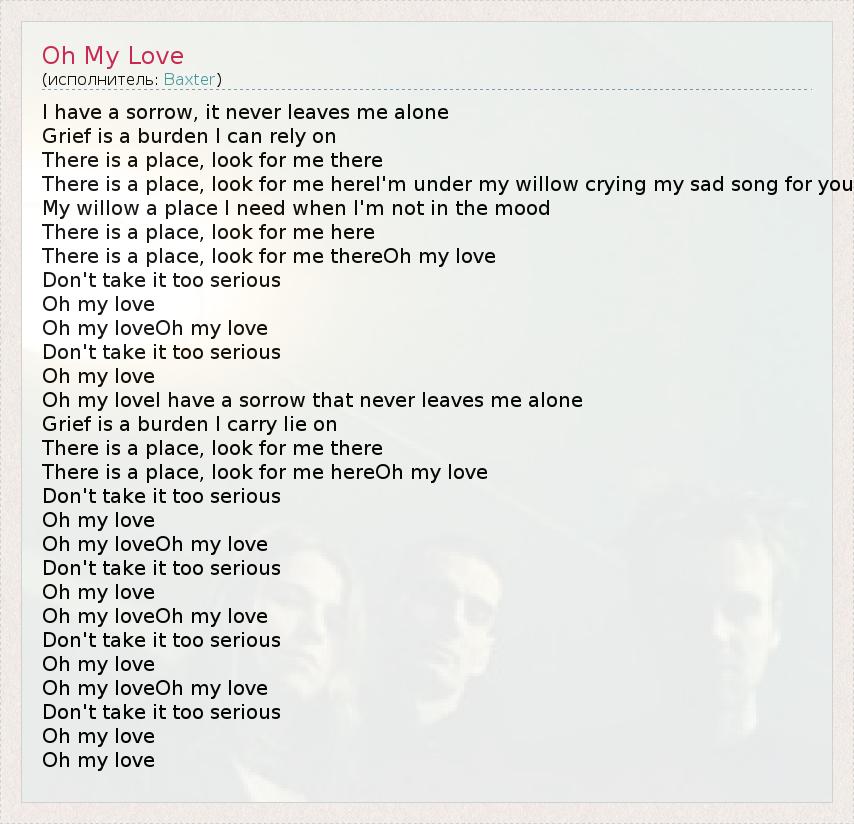 I have a sorrow, it never leaves me alone Grief is a burden I can rely on There is a place, look for me there There is a place, look for me hereI'm under my willow crying my sad song for you My willow a place I need when I'm not in the mood There is a place, look for me here There is a place, look for me thereOh my love Don't take it too serious Oh my love Oh my loveOh my love Don't take it too serious Oh my love Oh my loveI have a sorrow that never leaves me alone Grief is a burden I carry lie on There is a place, look for me there There is a place, look for me hereOh my love Don't take it too serious Oh my love Oh my loveOh my love Don't take it too serious Oh my love Oh my loveOh my love Don't take it too serious Oh my love Oh my loveOh my love Don't take it too serious Oh my love Oh my love