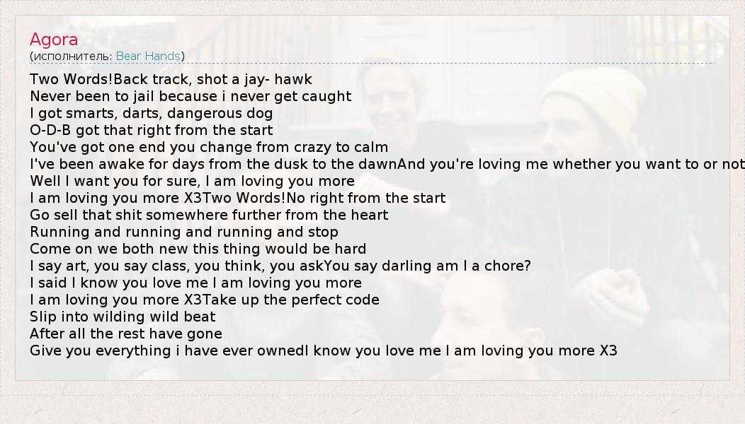 Two Words!Back track, shot a jay- hawk Never been to jail because i never get caught I got smarts, darts, dangerous dog O-D-B got that right from the start You've got one end you change from crazy to calm I've been awake for days from the dusk to the dawnAnd you're loving me whether you want to or not Well I want you for sure, I am loving you more I am loving you more X3Two Words!No right from the start Go sell that shit somewhere further from the heart Running and running and running and stop Come on we both new this thing would be hard I say art, you say class, you think, you askYou say darling am I a chore? I said I know you love me I am loving you more I am loving you more X3Take up the perfect code Slip into wilding wild beat After all the rest have gone Give you everything i have ever ownedI know you love me I am loving you more X3