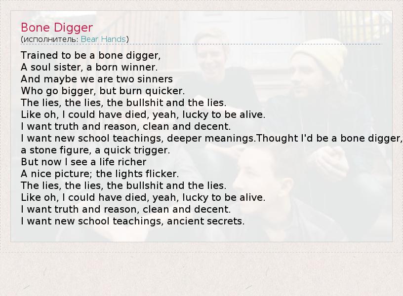 Trained to be a bone digger, A soul sister, a born winner. And maybe we are two sinners Who go bigger, but burn quicker. The lies, the lies, the bullshit and the lies. Like oh, I could have died, yeah, lucky to be alive. I want truth and reason, clean and decent. I want new school teachings, deeper meanings.Thought I'd be a bone digger, a stone figure, a quick trigger. But now I see a life richer A nice picture; the lights flicker. The lies, the lies, the bullshit and the lies. Like oh, I could have died, yeah, lucky to be alive. I want truth and reason, clean and decent. I want new school teachings, ancient secrets.