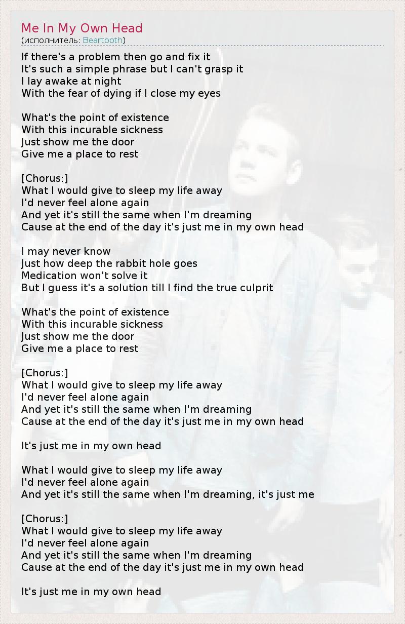 If there's a problem then go and fix it It's such a simple phrase but I can't grasp it I lay awake at night With the fear of dying if I close my eyes What's the point of existence With this incurable sickness Just show me the door Give me a place to rest [Chorus:] What I would give to sleep my life away I'd never feel alone again And yet it's still the same when I'm dreaming Cause at the end of the day it's just me in my own head I may never know Just how deep the rabbit hole goes Medication won't solve it But I guess it's a solution till I find the true culprit What's the point of existence With this incurable sickness Just show me the door Give me a place to rest [Chorus:] What I would give to sleep my life away I'd never feel alone again And yet it's still the same when I'm dreaming Cause at the end of the day it's just me in my own head It's just me in my own head What I would give to sleep my life away I'd never feel alone again And yet it's still the same when I'm dreaming, it's just me [Chorus:] What I would give to sleep my life away I'd never feel alone again And yet it's still the same when I'm dreaming Cause at the end of the day it's just me in my own head It's just me in my own head