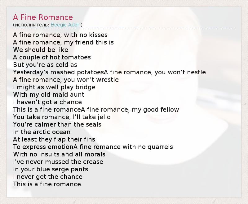 A fine romance, with no kisses A fine romance, my friend this is We should be like A couple of hot tomatoes But you're as cold as Yesterday's mashed potatoesA fine romance, you won't nestle A fine romance, you won't wrestle I might as well play bridge With my old maid aunt I haven't got a chance This is a fine romanceA fine romance, my good fellow You take romance, I'll take jello You're calmer than the seals In the arctic ocean At least they flap their fins To express emotionA fine romance with no quarrels With no insults and all morals I've never mussed the crease In your blue serge pants I never get the chance This is a fine romance