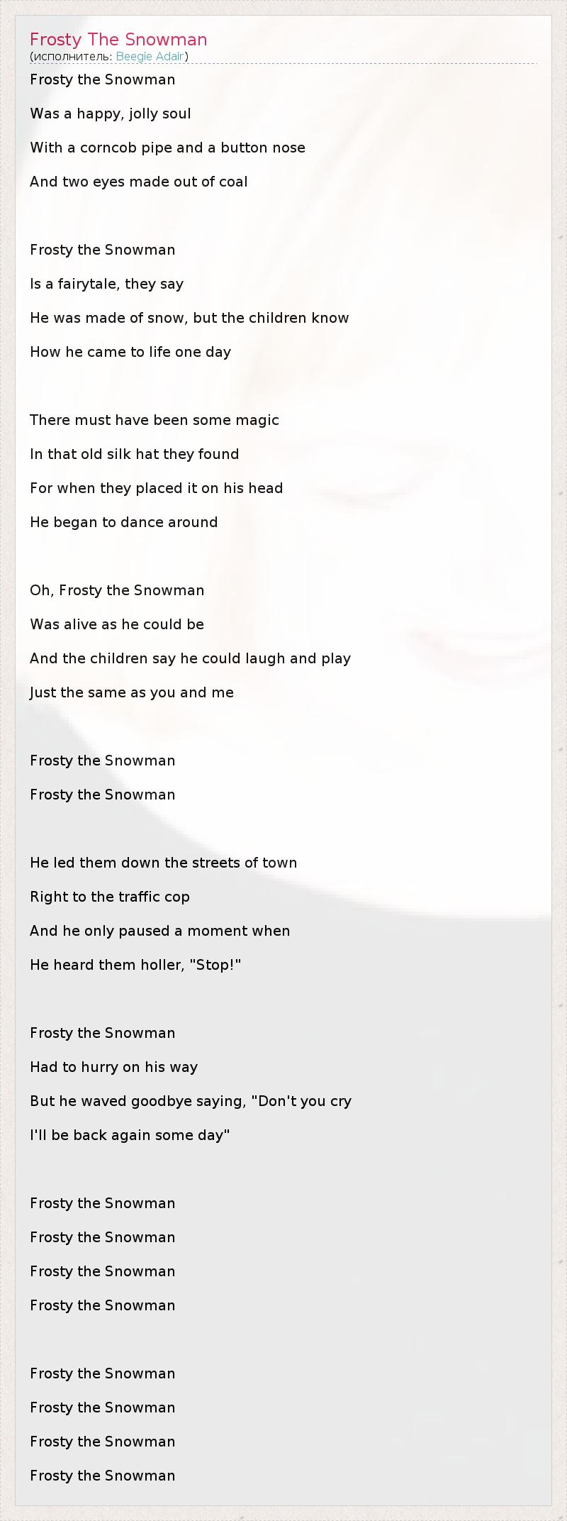 Frosty the Snowman Was a happy, jolly soul With a corncob pipe and a button nose And two eyes made out of coal Frosty the Snowman Is a fairytale, they say He was made of snow, but the children know How he came to life one day There must have been some magic In that old silk hat they found For when they placed it on his head He began to dance around Oh, Frosty the Snowman Was alive as he could be And the children say he could laugh and play Just the same as you and me Frosty the Snowman Frosty the Snowman He led them down the streets of town Right to the traffic cop And he only paused a moment when He heard them holler, "Stop!" Frosty the Snowman Had to hurry on his way But he waved goodbye saying, "Don't you cry I'll be back again some day" Frosty the Snowman Frosty the Snowman Frosty the Snowman Frosty the Snowman Frosty the Snowman Frosty the Snowman Frosty the Snowman Frosty the Snowman
