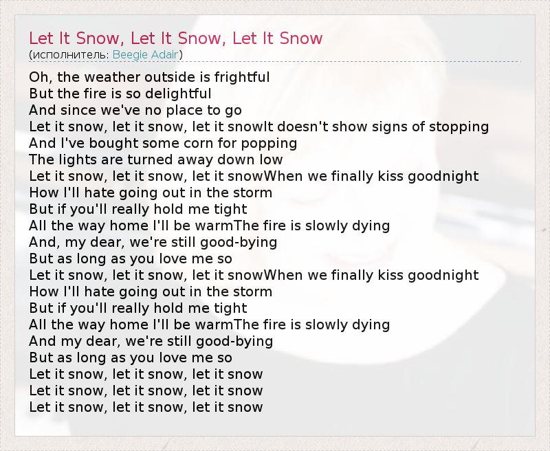 Oh, the weather outside is frightful But the fire is so delightful And since we've no place to go Let it snow, let it snow, let it snowIt doesn't show signs of stopping And I've bought some corn for popping The lights are turned away down low Let it snow, let it snow, let it snowWhen we finally kiss goodnight How I'll hate going out in the storm But if you'll really hold me tight All the way home I'll be warmThe fire is slowly dying And, my dear, we're still good-bying But as long as you love me so Let it snow, let it snow, let it snowWhen we finally kiss goodnight How I'll hate going out in the storm But if you'll really hold me tight All the way home I'll be warmThe fire is slowly dying And my dear, we're still good-bying But as long as you love me so Let it snow, let it snow, let it snow Let it snow, let it snow, let it snow Let it snow, let it snow, let it snow