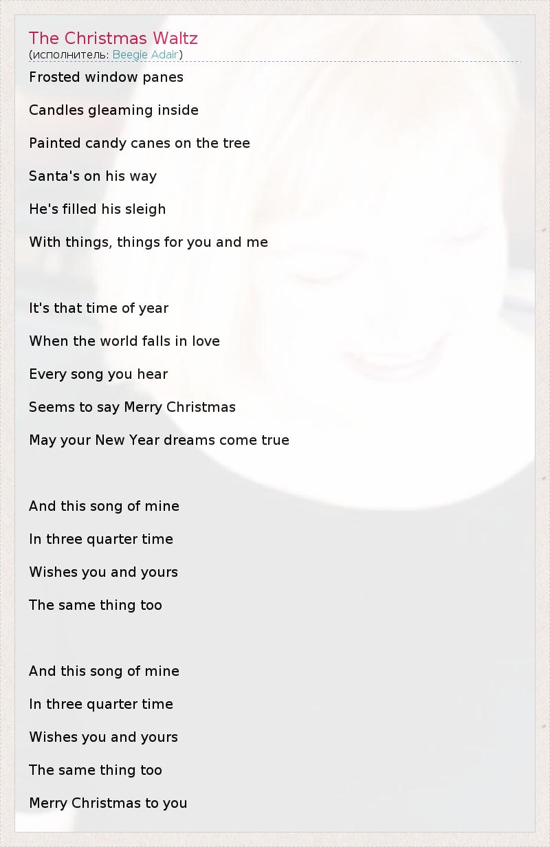 Frosted window panes Candles gleaming inside Painted candy canes on the tree Santa's on his way He's filled his sleigh With things, things for you and me It's that time of year When the world falls in love Every song you hear Seems to say Merry Christmas May your New Year dreams come true And this song of mine In three quarter time Wishes you and yours The same thing too And this song of mine In three quarter time Wishes you and yours The same thing too Merry Christmas to you