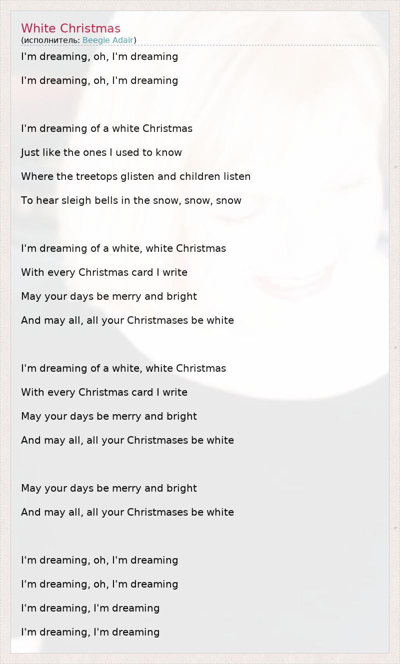 I'm dreaming, oh, I'm dreaming I'm dreaming, oh, I'm dreaming I'm dreaming of a white Christmas Just like the ones I used to know Where the treetops glisten and children listen To hear sleigh bells in the snow, snow, snow I'm dreaming of a white, white Christmas With every Christmas card I write May your days be merry and bright And may all, all your Christmases be white I'm dreaming of a white, white Christmas With every Christmas card I write May your days be merry and bright And may all, all your Christmases be white May your days be merry and bright And may all, all your Christmases be white I'm dreaming, oh, I'm dreaming I'm dreaming, oh, I'm dreaming I'm dreaming, I'm dreaming I'm dreaming, I'm dreaming