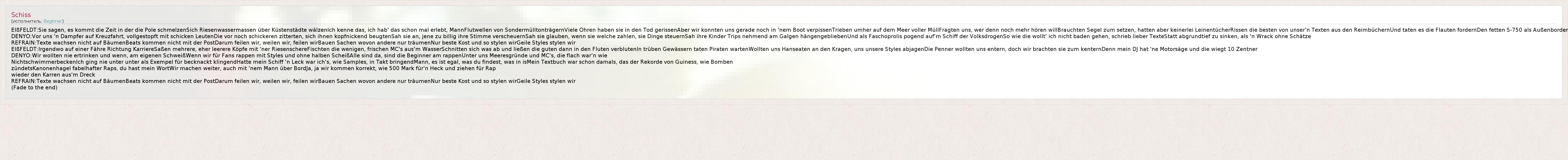 EIßFELDT:Sie sagen, es kommt die Zeit in der die Pole schmelzenSich Riesenwassermassen über Küstenstädte wälzenIch kenne das, ich hab' das schon mal erlebt, MannFlutwellen von SondermülltonträgernViele Ohren haben sie in den Tod gerissenAber wir konnten uns gerade noch in 'nem Boot verpissenTrieben umher auf dem Meer voller MüllFragten uns, wer denn noch mehr hören willBrauchten Segel zum setzen, hatten aber keinerlei LeinentücherRissen die besten von unser'n Texten aus den ReimbüchernUnd taten es die Flauten fordernDen fetten S-750 als Außenborder DENYO:Vor uns 'n Dampfer auf Kreuzfahrt, vollgestopft mit schicken LeutenDie vor noch schickeren zitterten, sich ihnen kopfnickend beugtenSah sie an, jene zu billig ihre Stimme verscheuernSah sie glauben, wenn sie welche zahlen, sie Dinge steuernSah ihre Kinder Trips nehmend am Galgen hängengebliebenUnd als Faschoprolis pogend auf'm Schiff der VolksdrogenSo wie die wollt' ich nicht baden gehen, schrieb lieber TexteStatt abgrundtief zu sinken, als 'n Wrack ohne Schätze REFRAIN:Texte wachsen nicht auf BäumenBeats kommen nicht mit der PostDarum feilen wir, weilen wir, feilen wirBauen Sachen wovon andere nur träumenNur beste Kost und so stylen wirGeile Styles stylen wir EIßFELDT:Irgendwo auf einer Fähre Richtung KarriereSaßen mehrere, eher leerere Köpfe mit 'ner RiesenschereFischten die wenigen, frischen MC's aus'm WasserSchnitten sich was ab und ließen die guten dann in den Fluten verblutenIn trüben Gewässern taten Piraten wartenWollten uns Hanseaten an den Kragen, uns unsere Styles abjagenDie Penner wollten uns entern, doch wir brachten sie zum kenternDenn mein DJ hat 'ne Motorsäge und die wiegt 10 Zentner DENYO:Wir wollten nie ertrinken und wenn, am eigenen SchweißWenn wir für Fans rappen mit Styles und ohne halben ScheißAlle sind da, sind die Beginner am rappenUnter uns Meeresgründe und MC's, die flach war'n wie NichtschwimmerbeckenIch ging nie unter unter als Exempel für becknackt klingendHatte mein Schiff 'n Leck war ich's, wie Samples, in Takt bringendMann, es ist egal, was du findest, was in isMein Textbuch war schon damals, das der Rekorde von Guiness, wie Bomben zündetsKanonenhagel fabelhafter Raps, du hast mein WortWir machen weiter, auch mit 'nem Mann über BordJa, ja wir kommen korrekt, wie 500 Mark für'n Heck und ziehen für Rap wieder den Karren aus'm Dreck REFRAIN:Texte wachsen nicht auf BäumenBeats kommen nicht mit der PostDarum feilen wir, weilen wir, feilen wirBauen Sachen wovon andere nur träumenNur beste Kost und so stylen wirGeile Styles stylen wir (Fade to the end)