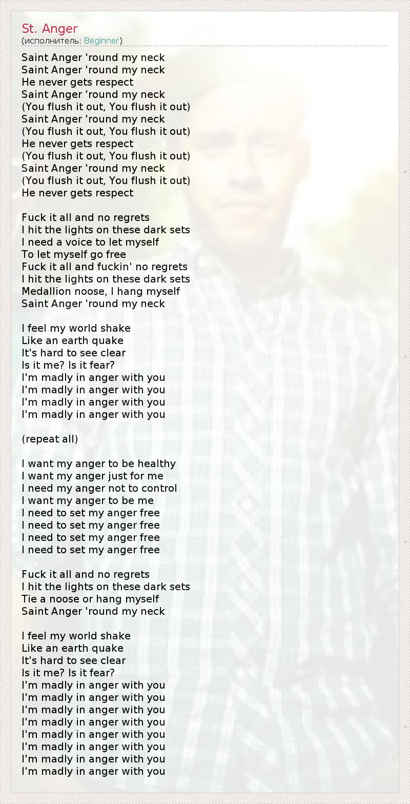 Saint Anger 'round my neck Saint Anger 'round my neck He never gets respect Saint Anger 'round my neck (You flush it out, You flush it out) Saint Anger 'round my neck (You flush it out, You flush it out) He never gets respect (You flush it out, You flush it out) Saint Anger 'round my neck (You flush it out, You flush it out) He never gets respect Fuck it all and no regrets I hit the lights on these dark sets I need a voice to let myself To let myself go free Fuck it all and fuckin' no regrets I hit the lights on these dark sets Medallion noose, I hang myself Saint Anger 'round my neck I feel my world shake Like an earth quake It's hard to see clear Is it me? Is it fear? I'm madly in anger with you I'm madly in anger with you I'm madly in anger with you I'm madly in anger with you (repeat all) I want my anger to be healthy I want my anger just for me I need my anger not to control I want my anger to be me I need to set my anger free I need to set my anger free I need to set my anger free I need to set my anger free Fuck it all and no regrets I hit the lights on these dark sets Tie a noose or hang myself Saint Anger 'round my neck I feel my world shake Like an earth quake It's hard to see clear Is it me? Is it fear? I'm madly in anger with you I'm madly in anger with you I'm madly in anger with you I'm madly in anger with you I'm madly in anger with you I'm madly in anger with you I'm madly in anger with you I'm madly in anger with you