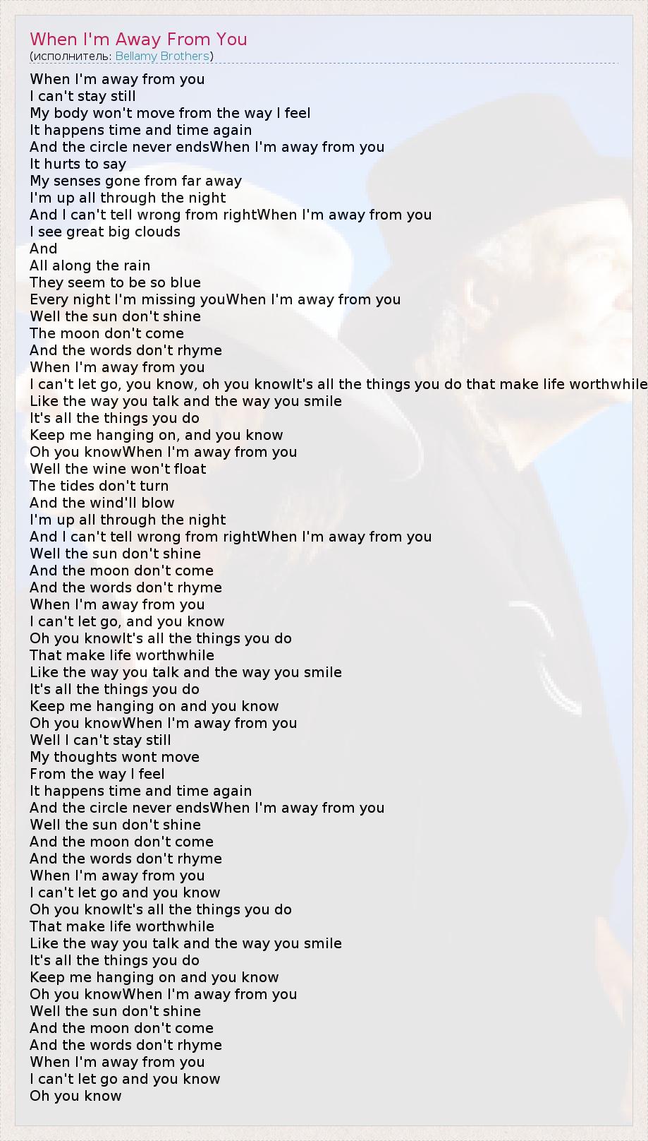 When I'm away from you I can't stay still My body won't move from the way I feel It happens time and time again And the circle never endsWhen I'm away from you It hurts to say My senses gone from far away I'm up all through the night And I can't tell wrong from rightWhen I'm away from you I see great big clouds And All along the rain They seem to be so blue Every night I'm missing youWhen I'm away from you Well the sun don't shine The moon don't come And the words don't rhyme When I'm away from you I can't let go, you know, oh you knowIt's all the things you do that make life worthwhile Like the way you talk and the way you smile It's all the things you do Keep me hanging on, and you know Oh you knowWhen I'm away from you Well the wine won't float The tides don't turn And the wind'll blow I'm up all through the night And I can't tell wrong from rightWhen I'm away from you Well the sun don't shine And the moon don't come And the words don't rhyme When I'm away from you I can't let go, and you know Oh you knowIt's all the things you do That make life worthwhile Like the way you talk and the way you smile It's all the things you do Keep me hanging on and you know Oh you knowWhen I'm away from you Well I can't stay still My thoughts wont move From the way I feel It happens time and time again And the circle never endsWhen I'm away from you Well the sun don't shine And the moon don't come And the words don't rhyme When I'm away from you I can't let go and you know Oh you knowIt's all the things you do That make life worthwhile Like the way you talk and the way you smile It's all the things you do Keep me hanging on and you know Oh you knowWhen I'm away from you Well the sun don't shine And the moon don't come And the words don't rhyme When I'm away from you I can't let go and you know Oh you know