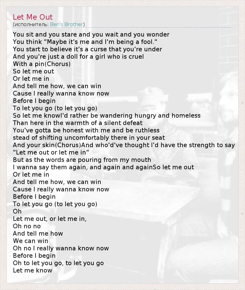 You sit and you stare and you wait and you wonder You think "Maybe it's me and I'm being a fool." You start to believe it's a curse that you're under And you're just a doll for a girl who is cruel With a pin(Chorus) So let me out Or let me in And tell me how, we can win Cause I really wanna know now Before I begin To let you go (to let you go) So let me knowI'd rather be wandering hungry and homeless Than here in the warmth of a silent defeat You've gotta be honest with me and be ruthless stead of shifting uncomfortably there in your seat And your skin(Chorus)And who'd've thought I'd have the strength to say "Let me out or let me in" But as the words are pouring from my mouth I wanna say them again, and again and againSo let me out Or let me in And tell me how, we can win Cause I really wanna know now Before I begin To let you go (to let you go) Oh Let me out, or let me in, Oh no no And tell me how We can win Oh no I really wanna know now Before I begin Oh to let you go, to let you go Let me know