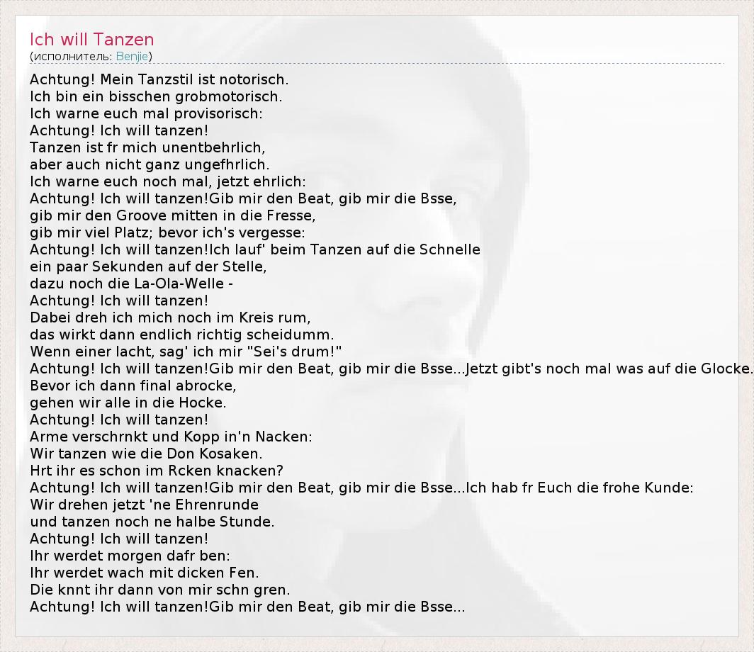 Achtung! Mein Tanzstil ist notorisch. Ich bin ein bisschen grobmotorisch. Ich warne euch mal provisorisch: Achtung! Ich will tanzen! Tanzen ist fr mich unentbehrlich, aber auch nicht ganz ungefhrlich. Ich warne euch noch mal, jetzt ehrlich: Achtung! Ich will tanzen!Gib mir den Beat, gib mir die Bsse, gib mir den Groove mitten in die Fresse, gib mir viel Platz; bevor ich's vergesse: Achtung! Ich will tanzen!Ich lauf' beim Tanzen auf die Schnelle ein paar Sekunden auf der Stelle, dazu noch die La-Ola-Welle - Achtung! Ich will tanzen! Dabei dreh ich mich noch im Kreis rum, das wirkt dann endlich richtig scheidumm. Wenn einer lacht, sag' ich mir "Sei's drum!" Achtung! Ich will tanzen!Gib mir den Beat, gib mir die Bsse...Jetzt gibt's noch mal was auf die Glocke. Bevor ich dann final abrocke, gehen wir alle in die Hocke. Achtung! Ich will tanzen! Arme verschrnkt und Kopp in'n Nacken: Wir tanzen wie die Don Kosaken. Hrt ihr es schon im Rcken knacken? Achtung! Ich will tanzen!Gib mir den Beat, gib mir die Bsse...Ich hab fr Euch die frohe Kunde: Wir drehen jetzt 'ne Ehrenrunde und tanzen noch ne halbe Stunde. Achtung! Ich will tanzen! Ihr werdet morgen dafr ben: Ihr werdet wach mit dicken Fen. Die knnt ihr dann von mir schn gren. Achtung! Ich will tanzen!Gib mir den Beat, gib mir die Bsse...