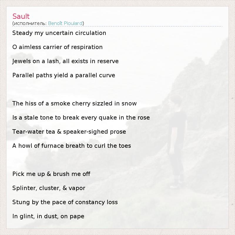 Steady my uncertain circulation O aimless carrier of respiration Jewels on a lash, all exists in reserve Parallel paths yield a parallel curve The hiss of a smoke cherry sizzled in snow Is a stale tone to break every quake in the rose Tear-water tea & speaker-sighed prose A howl of furnace breath to curl the toes Pick me up & brush me off Splinter, cluster, & vapor Stung by the pace of constancy loss In glint, in dust, on pape