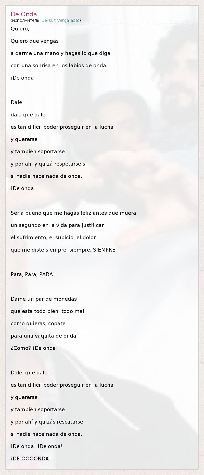 Это интересно:Bersuit Vergarabat, сформировались в 1989 в Аргентине и являются одними из наиболее известных исполнителей латинского рока 90-х.После 2 х андеграундовых альбомов, группа стала смешивать рок с латиноамериканскими ритмами такими как кумбиа(колумбийский народный танец), чакарера(испанский танец), кандомбе(негритянский танец под барабаны) и куртетанзо(тоже латинский... продолжение