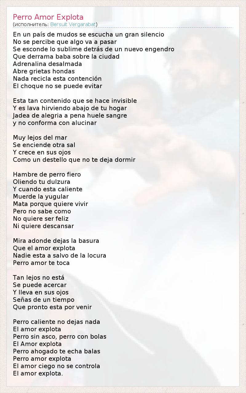 Ен Ун País де mudos себе Escucha ООН Gran Silencio Нет SE percibe Que Algo ва Pasar Се esconde вот возвышенное detrás де ООН Нуэво engendro Que derrama баба Sobre ла Сьюдад- Adrenalina desalmada Abre grietas Хонды Нада recicla ЭСТА contención не Эль Choque не себе Puede evitar Эста загар Contenido Que себе HACE невидимым У эс лавы hirviendo Абахо де Ту Hogar Jadea де Alegria Пена huele Sangre не у нет Conforma кон alucinar Muy Lejos-дель-Мар Се enciende Otra сал У Crece ан SUS Охос Комо ООН destello Que No Te дежа Dormir Hambre де Перро Fiero Oliendo ту dulzura У Cuando ЭСТА кальенте Muerde ла yugular Мата Porque quiere Vivir Перо не SABE Комо Нет quiere сер Feliz Ni quiere descansar Мира adonde Dejas ла Basura Que El Amor explota Nadie ЭСТА залп де-ла-Locura Перро Amor те TOCA Тан не Lejos не ЭСТА Се Puede acercar У lleva ан SUS Охос SENAS де снимите Tiempo Que Пронто ЭСТА POR venir Перро кальенте нет Dejas нада El Amor explota Перро грех ASCO, Перро кон Болас Эль Амор explota Перро ahogado те ИКГВ Балаш Перро Amor explota El Amor Сьего не себе controla El Amor explota.