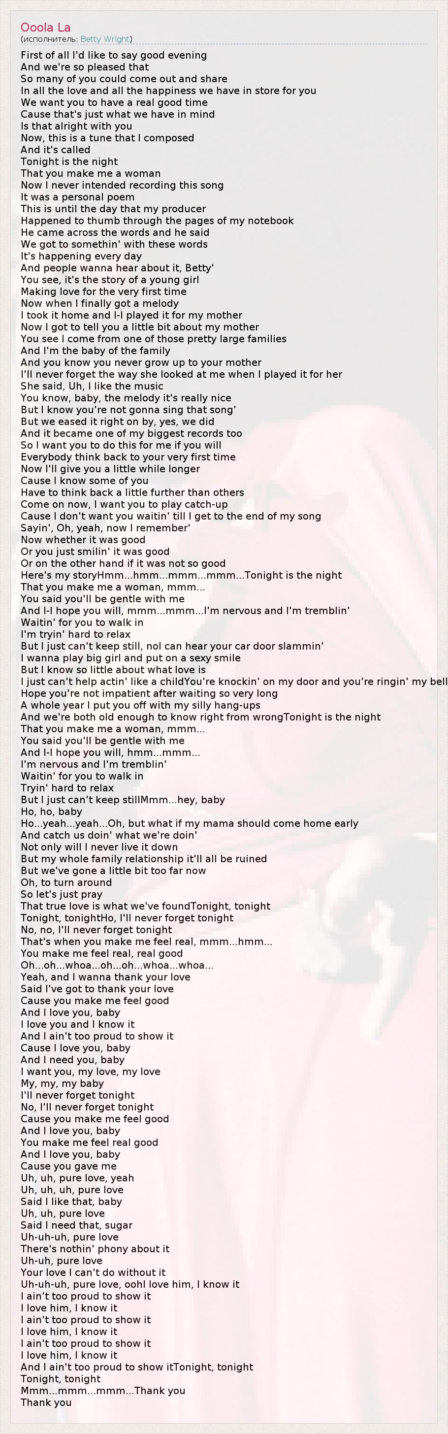 Это интересно:Betty Wright (born December 21, 1953) is a Grammy winning Miami-based soul and R&B singer who influenced a generation of female singer-songwriters and the world of hip hop, which has sampled some of her material. She should not be confused with the wife of gospel singer Rev. Timothy Wright who was also called Betty Wright.From singing gospel with the family group, the Echoes of Joy, Wright began a switch to R&B music in 1965 when she was eleven years old. In 1967, she discovered singers George and Gwen McCrae, and helped them sign to Henry Stone's Alston record label. In 1968, she released her first album, My First Time Around, at the age of 15, and scored her first hit single,... продолжение