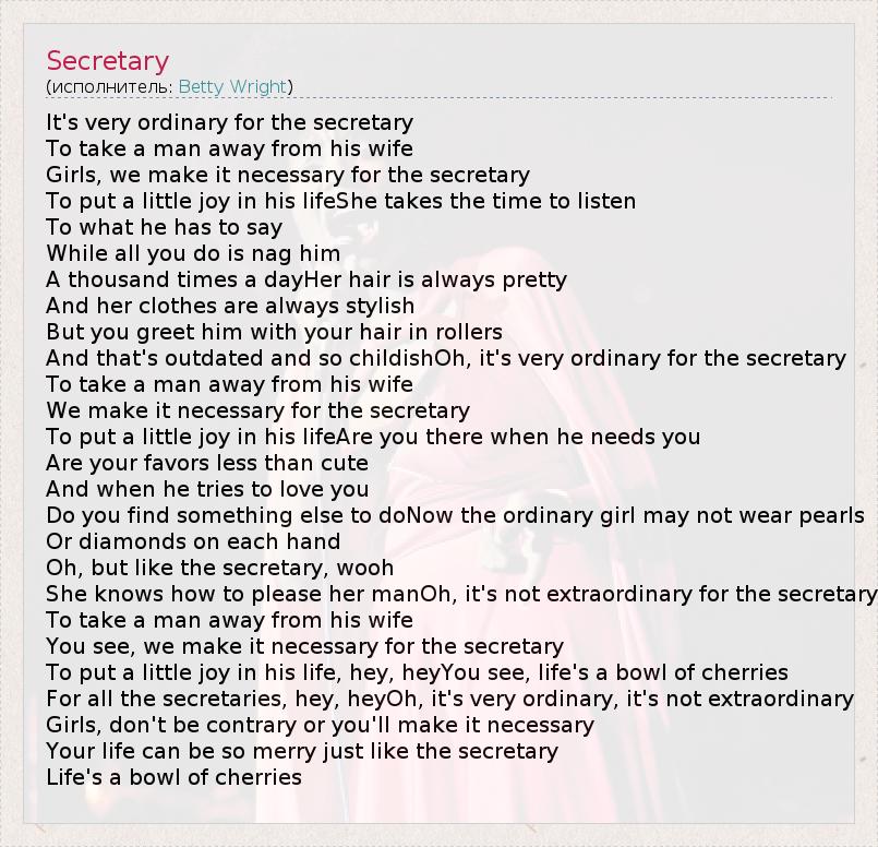 It's very ordinary for the secretary To take a man away from his wife Girls, we make it necessary for the secretary To put a little joy in his lifeShe takes the time to listen To what he has to say While all you do is nag him A thousand times a dayHer hair is always pretty And her clothes are always stylish But you greet him with your hair in rollers And that's outdated and so childishOh, it's very ordinary for the secretary To take a man away from his wife We make it necessary for the secretary To put a little joy in his lifeAre you there when he needs you Are your favors less than cute And when he tries to love you Do you find something else to doNow the ordinary girl may not wear pearls Or diamonds on each hand Oh, but like the secretary, wooh She knows how to please her manOh, it's not extraordinary for the secretary To take a man away from his wife You see, we make it necessary for the secretary To put a little joy in his life, hey, heyYou see, life's a bowl of cherries For all the secretaries, hey, heyOh, it's very ordinary, it's not extraordinary Girls, don't be contrary or you'll make it necessary Your life can be so merry just like the secretary Life's a bowl of cherries