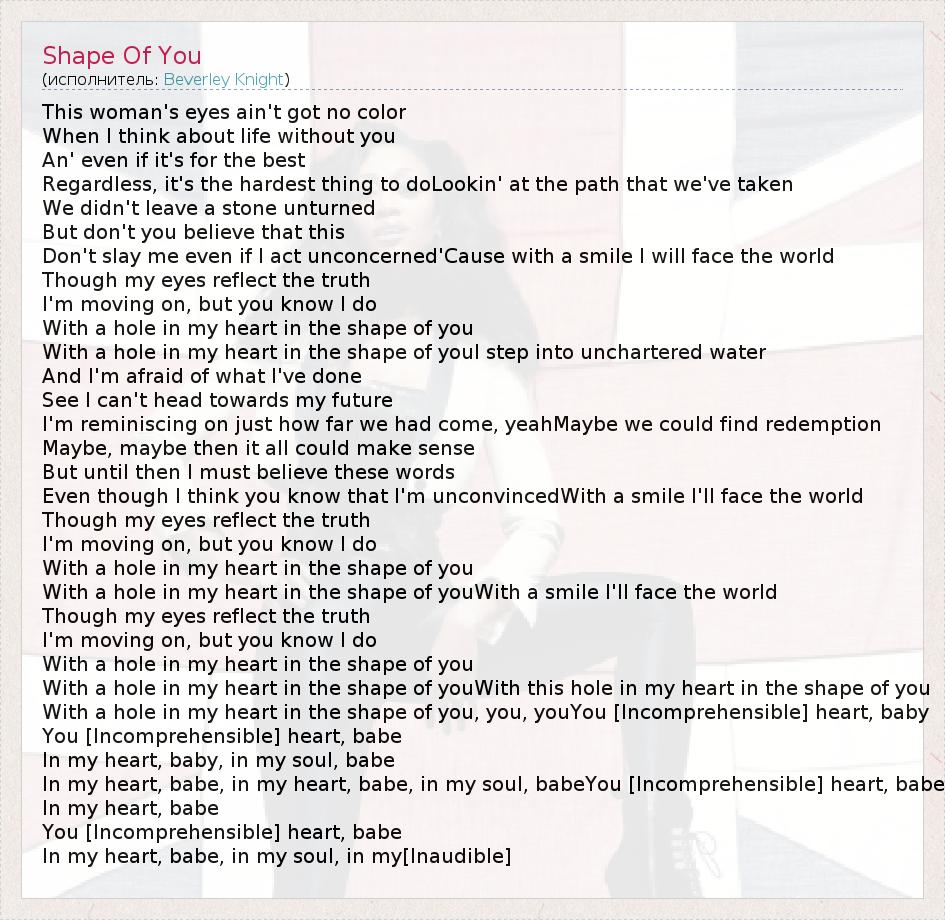 This woman's eyes ain't got no color When I think about life without you An' even if it's for the best Regardless, it's the hardest thing to doLookin' at the path that we've taken We didn't leave a stone unturned But don't you believe that this Don't slay me even if I act unconcerned'Cause with a smile I will face the world Though my eyes reflect the truth I'm moving on, but you know I do With a hole in my heart in the shape of you With a hole in my heart in the shape of youI step into unchartered water And I'm afraid of what I've done See I can't head towards my future I'm reminiscing on just how far we had come, yeahMaybe we could find redemption Maybe, maybe then it all could make sense But until then I must believe these words Even though I think you know that I'm unconvincedWith a smile I'll face the world Though my eyes reflect the truth I'm moving on, but you know I do With a hole in my heart in the shape of you With a hole in my heart in the shape of youWith a smile I'll face the world Though my eyes reflect the truth I'm moving on, but you know I do With a hole in my heart in the shape of you With a hole in my heart in the shape of youWith this hole in my heart in the shape of you With a hole in my heart in the shape of you, you, youYou [Incomprehensible] heart, baby You [Incomprehensible] heart, babe In my heart, baby, in my soul, babe In my heart, babe, in my heart, babe, in my soul, babeYou [Incomprehensible] heart, babe In my heart, babe You [Incomprehensible] heart, babe In my heart, babe, in my soul, in my[Inaudible]