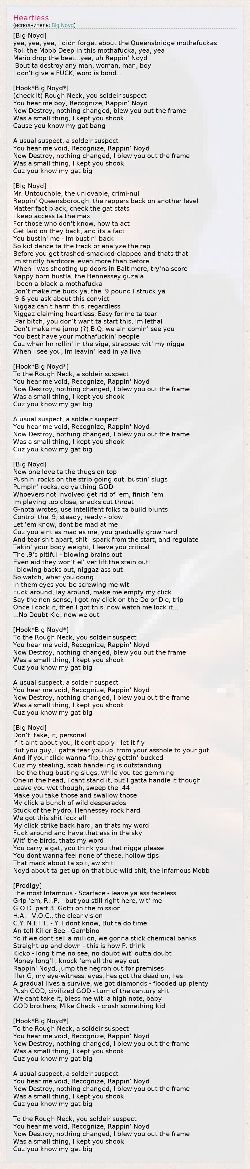 Это интересно:Big Noyd - американский рэпер, настоящее имя TaJuan Perry, родился 7 мая 1975 года и вырос в районе Квинс, Нью-Йорк.Он тесно связан с рэп группой Mobb Deep, и принимал участие в семи студийных альбомах этого знаменитого дуэта. Вместе они создали много отличных треков, миллионы копий которых разошлись по всему миру.Также Noyd работал с 50 Cent, Cormega и Rakim.Big Noyd дебютировал в 1993 году, исполнив партию речитатива... продолжение