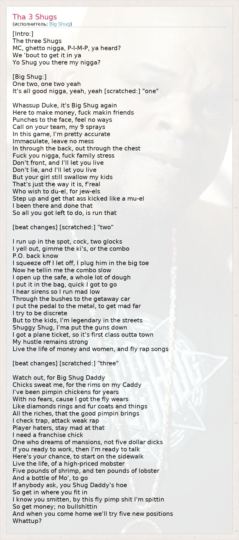 [Intro:] The three Shugs MC, ghetto nigga, P-I-M-P, ya heard? We 'bout to get it in ya Yo Shug you there my nigga? [Big Shug:] One two, one two yeah It's all good nigga, yeah, yeah [scratched:] "one" Whassup Duke, it's Big Shug again Here to make money, fuck makin friends Punches to the face, feel no ways Call on your team, my 9 sprays In this game, I'm pretty accurate Immaculate, leave no mess In through the back, out through the chest Fuck you nigga, fuck family stress Don't front, and I'll let you live Don't lie, and I'll let you live But your girl still swallow my kids That's just the way it is, f'real Who wish to du-el, for jew-els Step up and get that ass kicked like a mu-el I been there and done that So all you got left to do, is run that [beat changes] [scratched:] "two" I run up in the spot, cock, two glocks I yell out, gimme the ki's, or the combo P.O. back know I squeeze off I let off, I plug him in the big toe Now he tellin me the combo slow I open up the safe, a whole lot of dough I put it in the bag, quick I got to go I hear sirens so I run mad low Through the bushes to the getaway car I put the pedal to the metal, to get mad far I try to be discrete But to the kids, I'm legendary in the streets Shuggy Shug, I'ma put the guns down I got a plane ticket, so it's first class outta town My hustle remains strong Live the life of money and women, and fly rap songs [beat changes] [scratched:] "three" Watch out, for Big Shug Daddy Chicks sweat me, for the rims on my Caddy I've been pimpin chickens for years With no fears, cause I got the fly wears Like diamonds rings and fur coats and things All the riches, that the good pimpin brings I check trap, attack weak rap Player haters, stay mad at that I need a franchise chick One who dreams of mansions, not five dollar dicks If you ready to work, then I'm ready to talk Here's your chance, to start on the sidewalk Live the life, of a high-priced mobster Five pounds of shrimp, and ten pounds of lobster And a bottle of Mo', to go If anybody ask, you Shug Daddy's hoe So get in where you fit in I know you smitten, by this fly pimp shit I'm spittin So get money; no bullshittin And when you come home we'll try five new positions Whattup?