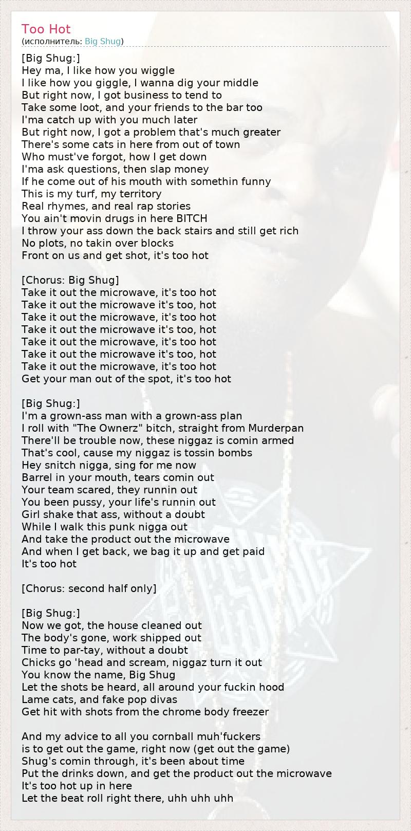 [Big Shug:] Hey ma, I like how you wiggle I like how you giggle, I wanna dig your middle But right now, I got business to tend to Take some loot, and your friends to the bar too I'ma catch up with you much later But right now, I got a problem that's much greater There's some cats in here from out of town Who must've forgot, how I get down I'ma ask questions, then slap money If he come out of his mouth with somethin funny This is my turf, my territory Real rhymes, and real rap stories You ain't movin drugs in here BITCH I throw your ass down the back stairs and still get rich No plots, no takin over blocks Front on us and get shot, it's too hot [Chorus: Big Shug] Take it out the microwave, it's too hot Take it out the microwave it's too, hot Take it out the microwave, it's too hot Take it out the microwave it's too, hot Take it out the microwave, it's too hot Take it out the microwave it's too, hot Take it out the microwave, it's too hot Get your man out of the spot, it's too hot [Big Shug:] I'm a grown-ass man with a grown-ass plan I roll with "The Ownerz" bitch, straight from Murderpan There'll be trouble now, these niggaz is comin armed That's cool, cause my niggaz is tossin bombs Hey snitch nigga, sing for me now Barrel in your mouth, tears comin out Your team scared, they runnin out You been pussy, your life's runnin out Girl shake that ass, without a doubt While I walk this punk nigga out And take the product out the microwave And when I get back, we bag it up and get paid It's too hot [Chorus: second half only] [Big Shug:] Now we got, the house cleaned out The body's gone, work shipped out Time to par-tay, without a doubt Chicks go 'head and scream, niggaz turn it out You know the name, Big Shug Let the shots be heard, all around your fuckin hood Lame cats, and fake pop divas Get hit with shots from the chrome body freezer And my advice to all you cornball muh'fuckers is to get out the game, right now (get out the game) Shug's comin through, it's been about time Put the drinks down, and get the product out the microwave It's too hot up in here Let the beat roll right there, uhh uhh uhh
