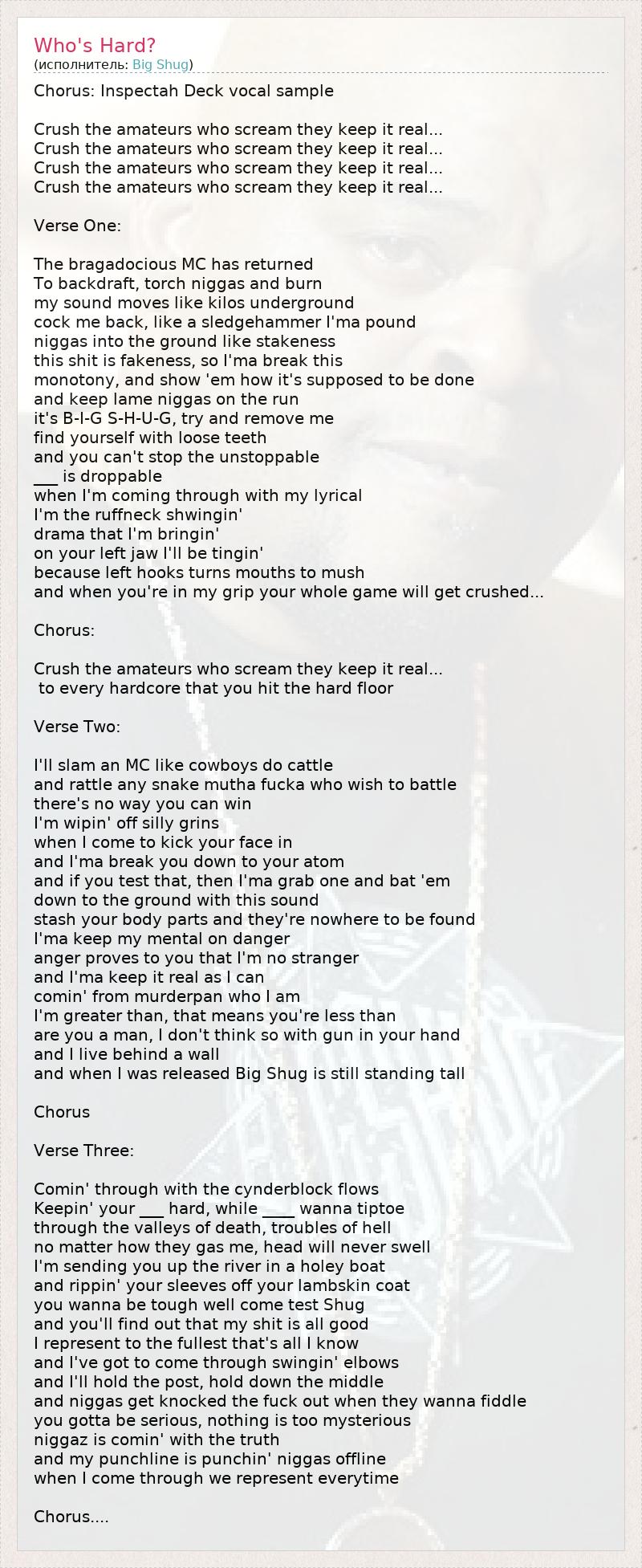 Chorus: Inspectah Deck vocal sample Crush the amateurs who scream they keep it real... Crush the amateurs who scream they keep it real... Crush the amateurs who scream they keep it real... Crush the amateurs who scream they keep it real... Verse One: The bragadocious MC has returned To backdraft, torch niggas and burn my sound moves like kilos underground cock me back, like a sledgehammer I'ma pound niggas into the ground like stakeness this shit is fakeness, so I'ma break this monotony, and show 'em how it's supposed to be done and keep lame niggas on the run it's B-I-G S-H-U-G, try and remove me find yourself with loose teeth and you can't stop the unstoppable ___ is droppable when I'm coming through with my lyrical I'm the ruffneck shwingin' drama that I'm bringin' on your left jaw I'll be tingin' because left hooks turns mouths to mush and when you're in my grip your whole game will get crushed... Chorus: Crush the amateurs who scream they keep it real... to every hardcore that you hit the hard floor Verse Two: I'll slam an MC like cowboys do cattle and rattle any snake mutha fucka who wish to battle there's no way you can win I'm wipin' off silly grins when I come to kick your face in and I'ma break you down to your atom and if you test that, then I'ma grab one and bat 'em down to the ground with this sound stash your body parts and they're nowhere to be found I'ma keep my mental on danger anger proves to you that I'm no stranger and I'ma keep it real as I can comin' from murderpan who I am I'm greater than, that means you're less than are you a man, I don't think so with gun in your hand and I live behind a wall and when I was released Big Shug is still standing tall Chorus Verse Three: Comin' through with the cynderblock flows Keepin' your ___ hard, while ____ wanna tiptoe through the valleys of death, troubles of hell no matter how they gas me, head will never swell I'm sending you up the river in a holey boat and rippin' your sleeves off your lambskin coat you wanna be tough well come test Shug and you'll find out that my shit is all good I represent to the fullest that's all I know and I've got to come through swingin' elbows and I'll hold the post, hold down the middle and niggas get knocked the fuck out when they wanna fiddle you gotta be serious, nothing is too mysterious niggaz is comin' with the truth and my punchline is punchin' niggas offline when I come through we represent everytime Chorus....