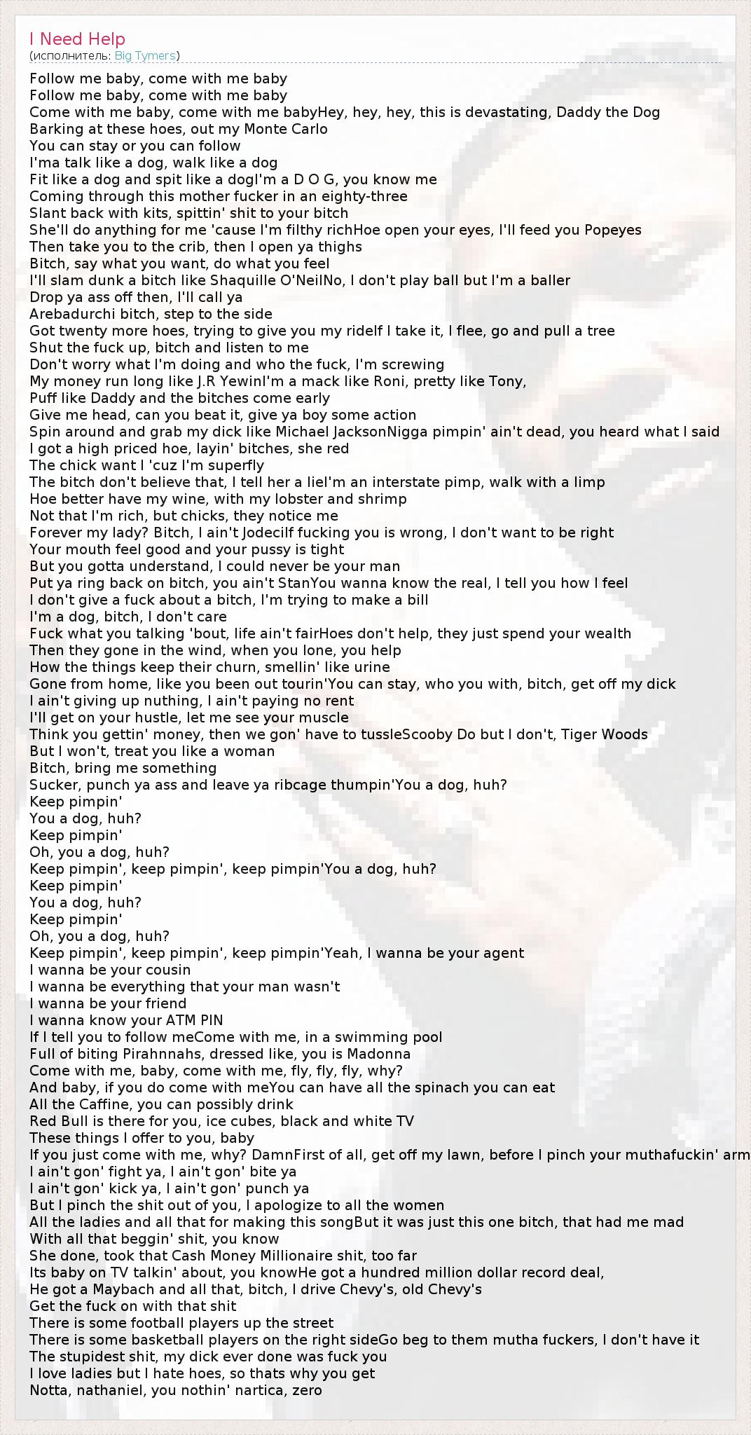 Follow me baby, come with me baby Follow me baby, come with me baby Come with me baby, come with me babyHey, hey, hey, this is devastating, Daddy the Dog Barking at these hoes, out my Monte Carlo You can stay or you can follow I'ma talk like a dog, walk like a dog Fit like a dog and spit like a dogI'm a D O G, you know me Coming through this mother fucker in an eighty-three Slant back with kits, spittin' shit to your bitch She'll do anything for me 'cause I'm filthy richHoe open your eyes, I'll feed you Popeyes Then take you to the crib, then I open ya thighs Bitch, say what you want, do what you feel I'll slam dunk a bitch like Shaquille O'NeilNo, I don't play ball but I'm a baller Drop ya ass off then, I'll call ya Arebadurchi bitch, step to the side Got twenty more hoes, trying to give you my rideIf I take it, I flee, go and pull a tree Shut the fuck up, bitch and listen to me Don't worry what I'm doing and who the fuck, I'm screwing My money run long like J.R YewinI'm a mack like Roni, pretty like Tony, Puff like Daddy and the bitches come early Give me head, can you beat it, give ya boy some action Spin around and grab my dick like Michael JacksonNigga pimpin' ain't dead, you heard what I said I got a high priced hoe, layin' bitches, she red The chick want I 'cuz I'm superfly The bitch don't believe that, I tell her a lieI'm an interstate pimp, walk with a limp Hoe better have my wine, with my lobster and shrimp Not that I'm rich, but chicks, they notice me Forever my lady? Bitch, I ain't JodeciIf fucking you is wrong, I don't want to be right Your mouth feel good and your pussy is tight But you gotta understand, I could never be your man Put ya ring back on bitch, you ain't StanYou wanna know the real, I tell you how I feel I don't give a fuck about a bitch, I'm trying to make a bill I'm a dog, bitch, I don't care Fuck what you talking 'bout, life ain't fairHoes don't help, they just spend your wealth Then they gone in the wind, when you lone, you help How the things keep their churn, smellin' like urine Gone from home, like you been out tourin'You can stay, who you with, bitch, get off my dick I ain't giving up nuthing, I ain't paying no rent I'll get on your hustle, let me see your muscle Think you gettin' money, then we gon' have to tussleScooby Do but I don't, Tiger Woods But I won't, treat you like a woman Bitch, bring me something Sucker, punch ya ass and leave ya ribcage thumpin'You a dog, huh? Keep pimpin' You a dog, huh? Keep pimpin' Oh, you a dog, huh? Keep pimpin', keep pimpin', keep pimpin'You a dog, huh? Keep pimpin' You a dog, huh? Keep pimpin' Oh, you a dog, huh? Keep pimpin', keep pimpin', keep pimpin'Yeah, I wanna be your agent I wanna be your cousin I wanna be everything that your man wasn't I wanna be your friend I wanna know your ATM PIN If I tell you to follow meCome with me, in a swimming pool Full of biting Pirahnnahs, dressed like, you is Madonna Come with me, baby, come with me, fly, fly, fly, why? And baby, if you do come with meYou can have all the spinach you can eat All the Caffine, you can possibly drink Red Bull is there for you, ice cubes, black and white TV These things I offer to you, baby If you just come with me, why? DamnFirst of all, get off my lawn, before I pinch your muthafuckin' arm I ain't gon' fight ya, I ain't gon' bite ya I ain't gon' kick ya, I ain't gon' punch ya But I pinch the shit out of you, I apologize to all the women All the ladies and all that for making this songBut it was just this one bitch, that had me mad With all that beggin' shit, you know She done, took that Cash Money Millionaire shit, too far Its baby on TV talkin' about, you knowHe got a hundred million dollar record deal, He got a Maybach and all that, bitch, I drive Chevy's, old Chevy's Get the fuck on with that shit There is some football players up the street There is some basketball players on the right sideGo beg to them mutha fuckers, I don't have it The stupidest shit, my dick ever done was fuck you I love ladies but I hate hoes, so thats why you get Notta, nathaniel, you nothin' nartica, zero