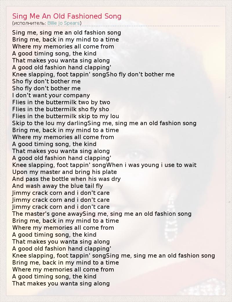 Sing me, sing me an old fashion song Bring me, back in my mind to a time Where my memories all come from A good timing song, the kind That makes you wanta sing along A good old fashion hand clapping' Knee slapping, foot tappin' songSho fly don't bother me Sho fly don't bother me Sho fly don't bother me I don't want your company Flies in the buttermilk two by two Flies in the buttermilk sho fly sho Flies in the buttermilk skip to my lou Skip to the lou my darlingSing me, sing me an old fashion song Bring me, back in my mind to a time Where my memories all come from A good timing song, the kind That makes you wanta sing along A good old fashion hand clapping' Knee slapping, foot tappin' songWhen i was young i use to wait Upon my master and bring his plate And pass the bottle when his was dry And wash away the blue tail fly Jimmy crack corn and i don't care Jimmy crack corn and i don't care Jimmy crack corn and i don't care The master's gone awaySing me, sing me an old fashion song Bring me, back in my mind to a time Where my memories all come from A good timing song, the kind That makes you wanta sing along A good old fashion hand clapping' Knee slapping, foot tappin' songSing me, sing me an old fashion song Bring me, back in my mind to a time Where my memories all come from A good timing song, the kind That makes you wanta sing along