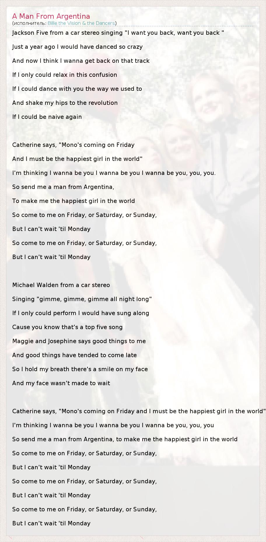 Jackson Five from a car stereo singing "I want you back, want you back " Just a year ago I would have danced so crazy And now I think I wanna get back on that track If I only could relax in this confusion If I could dance with you the way we used to And shake my hips to the revolution If I could be naive again Catherine says, "Mono's coming on Friday And I must be the happiest girl in the world" I'm thinking I wanna be you I wanna be you I wanna be you, you, you. So send me a man from Argentina, To make me the happiest girl in the world So come to me on Friday, or Saturday, or Sunday, But I can't wait 'til Monday So come to me on Friday, or Saturday, or Sunday, But I can't wait 'til Monday Michael Walden from a car stereo Singing "gimme, gimme, gimme all night long" If I only could perform I would have sung along Cause you know that's a top five song Maggie and Josephine says good things to me And good things have tended to come late So I hold my breath there's a smile on my face And my face wasn't made to wait Catherine says, "Mono's coming on Friday and I must be the happiest girl in the world" I'm thinking I wanna be you I wanna be you I wanna be you, you, you So send me a man from Argentina, to make me the happiest girl in the world So come to me on Friday, or Saturday, or Sunday, But I can't wait 'til Monday So come to me on Friday, or Saturday, or Sunday, But I can't wait 'til Monday So come to me on Friday, or Saturday, or Sunday, But I can't wait 'til Monday