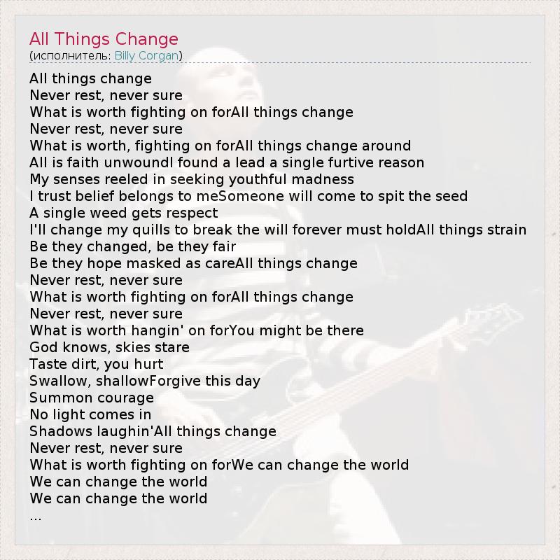 All things change Never rest, never sure What is worth fighting on forAll things change Never rest, never sure What is worth, fighting on forAll things change around All is faith unwoundI found a lead a single furtive reason My senses reeled in seeking youthful madness I trust belief belongs to meSomeone will come to spit the seed A single weed gets respect I'll change my quills to break the will forever must holdAll things strain Be they changed, be they fair Be they hope masked as careAll things change Never rest, never sure What is worth fighting on forAll things change Never rest, never sure What is worth hangin' on forYou might be there God knows, skies stare Taste dirt, you hurt Swallow, shallowForgive this day Summon courage No light comes in Shadows laughin'All things change Never rest, never sure What is worth fighting on forWe can change the world We can change the world We can change the world ...