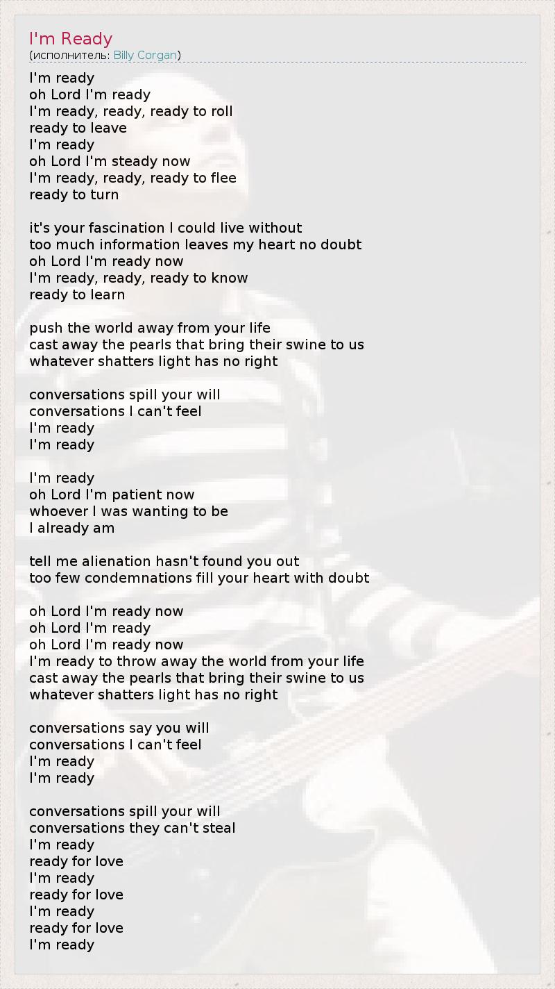 I'm ready oh Lord I'm ready I'm ready, ready, ready to roll ready to leave I'm ready oh Lord I'm steady now I'm ready, ready, ready to flee ready to turn it's your fascination I could live without too much information leaves my heart no doubt oh Lord I'm ready now I'm ready, ready, ready to know ready to learn push the world away from your life cast away the pearls that bring their swine to us whatever shatters light has no right conversations spill your will conversations I can't feel I'm ready I'm ready I'm ready oh Lord I'm patient now whoever I was wanting to be I already am tell me alienation hasn't found you out too few condemnations fill your heart with doubt oh Lord I'm ready now oh Lord I'm ready oh Lord I'm ready now I'm ready to throw away the world from your life cast away the pearls that bring their swine to us whatever shatters light has no right conversations say you will conversations I can't feel I'm ready I'm ready conversations spill your will conversations they can't steal I'm ready ready for love I'm ready ready for love I'm ready ready for love I'm ready