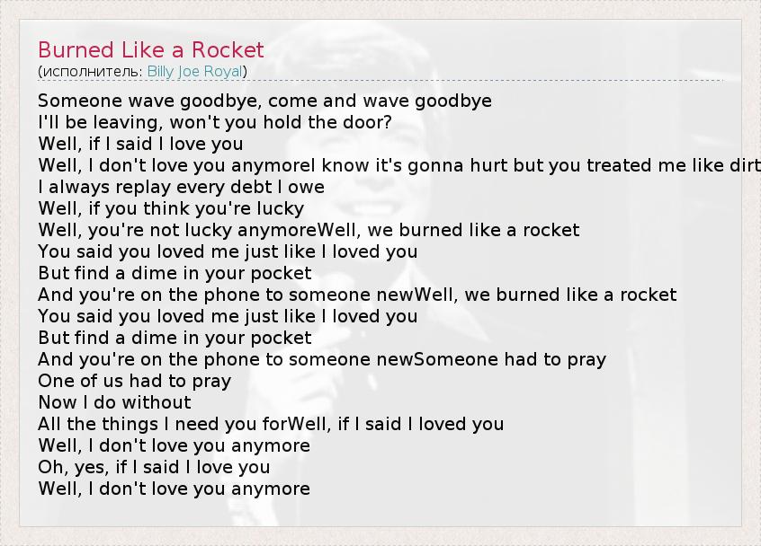 Someone wave goodbye, come and wave goodbye I'll be leaving, won't you hold the door? Well, if I said I love you Well, I don't love you anymoreI know it's gonna hurt but you treated me like dirt I always replay every debt I owe Well, if you think you're lucky Well, you're not lucky anymoreWell, we burned like a rocket You said you loved me just like I loved you But find a dime in your pocket And you're on the phone to someone newWell, we burned like a rocket You said you loved me just like I loved you But find a dime in your pocket And you're on the phone to someone newSomeone had to pray One of us had to pray Now I do without All the things I need you forWell, if I said I loved you Well, I don't love you anymore Oh, yes, if I said I love you Well, I don't love you anymore