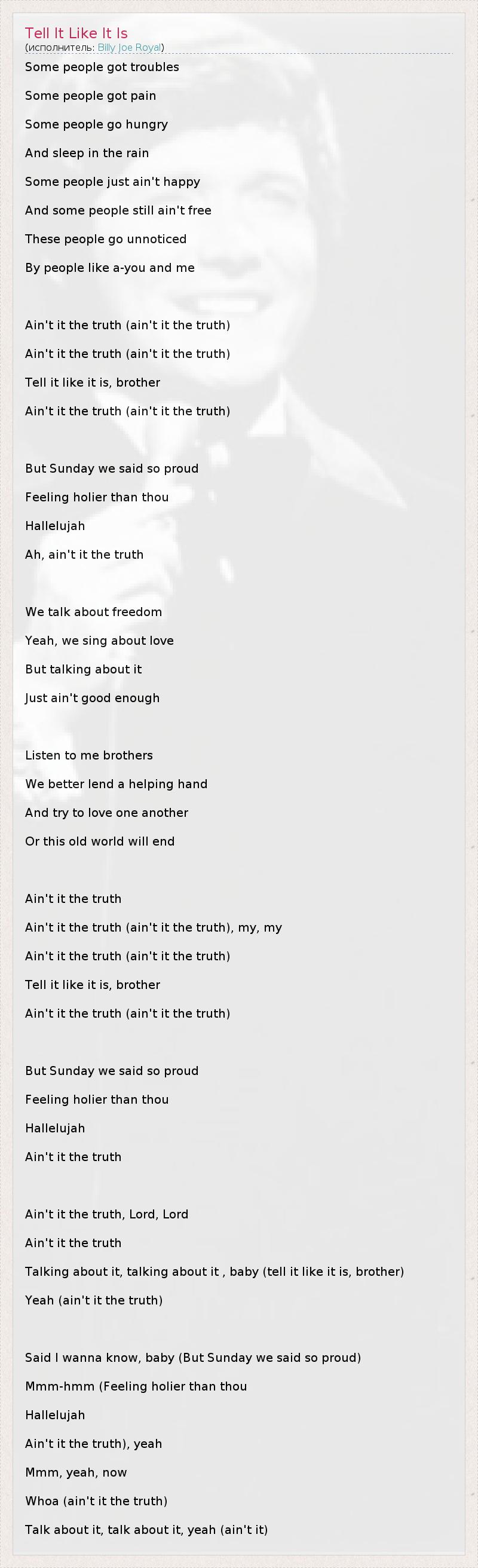 А как ты думаешь, о чем песня "Tell It Like It Is" ?