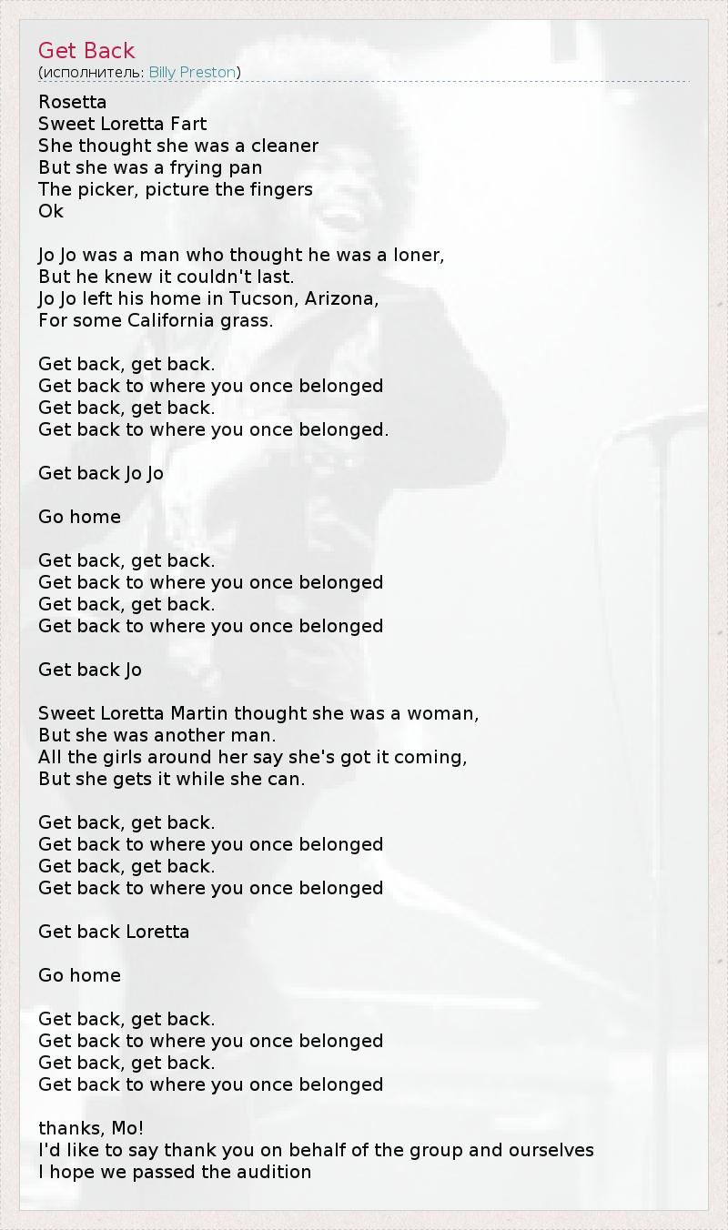 Rosetta Sweet Loretta Fart She thought she was a cleaner But she was a frying pan The picker, picture the fingers Ok Jo Jo was a man who thought he was a loner, But he knew it couldn't last. Jo Jo left his home in Tucson, Arizona, For some California grass. Get back, get back. Get back to where you once belonged Get back, get back. Get back to where you once belonged. Get back Jo Jo Go home Get back, get back. Get back to where you once belonged Get back, get back. Get back to where you once belonged Get back Jo Sweet Loretta Martin thought she was a woman, But she was another man. All the girls around her say she's got it coming, But she gets it while she can. Get back, get back. Get back to where you once belonged Get back, get back. Get back to where you once belonged Get back Loretta Go home Get back, get back. Get back to where you once belonged Get back, get back. Get back to where you once belonged thanks, Mo! I'd like to say thank you on behalf of the group and ourselves I hope we passed the audition