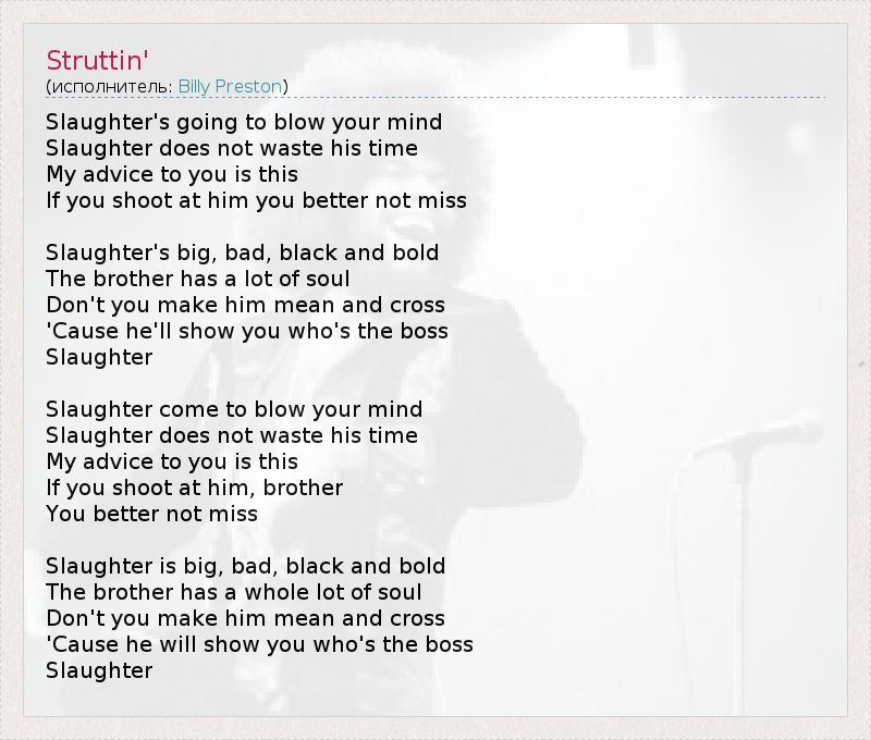 Slaughter's going to blow your mind Slaughter does not waste his time My advice to you is this If you shoot at him you better not miss Slaughter's big, bad, black and bold The brother has a lot of soul Don't you make him mean and cross 'Cause he'll show you who's the boss Slaughter Slaughter come to blow your mind Slaughter does not waste his time My advice to you is this If you shoot at him, brother You better not miss Slaughter is big, bad, black and bold The brother has a whole lot of soul Don't you make him mean and cross 'Cause he will show you who's the boss Slaughter
