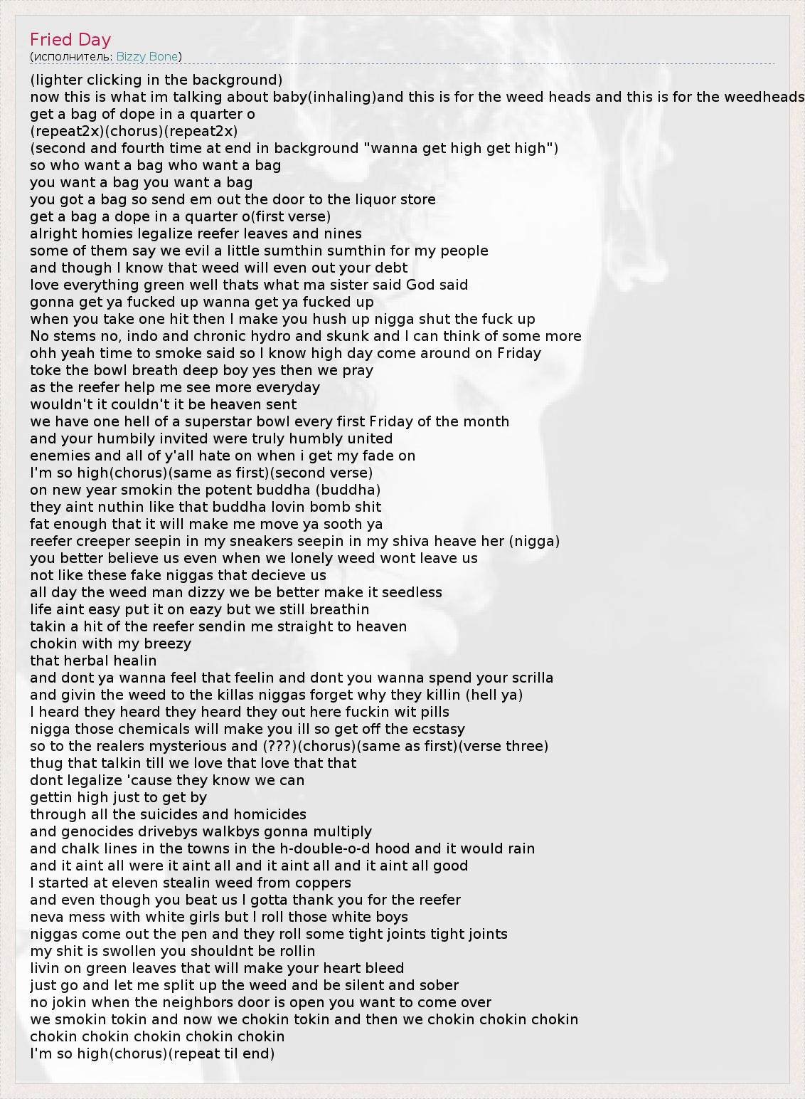 (lighter clicking in the background) now this is what im talking about baby(inhaling)and this is for the weed heads and this is for the weedheads get a bag of dope in a quarter o (repeat2x)(chorus)(repeat2x) (second and fourth time at end in background "wanna get high get high") so who want a bag who want a bag you want a bag you want a bag you got a bag so send em out the door to the liquor store get a bag a dope in a quarter o(first verse) alright homies legalize reefer leaves and nines some of them say we evil a little sumthin sumthin for my people and though I know that weed will even out your debt love everything green well thats what ma sister said God said gonna get ya fucked up wanna get ya fucked up when you take one hit then I make you hush up nigga shut the fuck up No stems no, indo and chronic hydro and skunk and I can think of some more ohh yeah time to smoke said so I know high day come around on Friday toke the bowl breath deep boy yes then we pray as the reefer help me see more everyday wouldn't it couldn't it be heaven sent we have one hell of a superstar bowl every first Friday of the month and your humbily invited were truly humbly united enemies and all of y'all hate on when i get my fade on I'm so high(chorus)(same as first)(second verse) on new year smokin the potent buddha (buddha) they aint nuthin like that buddha lovin bomb shit fat enough that it will make me move ya sooth ya reefer creeper seepin in my sneakers seepin in my shiva heave her (nigga) you better believe us even when we lonely weed wont leave us not like these fake niggas that decieve us all day the weed man dizzy we be better make it seedless life aint easy put it on eazy but we still breathin takin a hit of the reefer sendin me straight to heaven chokin with my breezy that herbal healin and dont ya wanna feel that feelin and dont you wanna spend your scrilla and givin the weed to the killas niggas forget why they killin (hell ya) I heard they heard they heard they out here fuckin wit pills nigga those chemicals will make you ill so get off the ecstasy so to the realers mysterious and (???)(chorus)(same as first)(verse three) thug that talkin till we love that love that that dont legalize 'cause they know we can gettin high just to get by through all the suicides and homicides and genocides drivebys walkbys gonna multiply and chalk lines in the towns in the h-double-o-d hood and it would rain and it aint all were it aint all and it aint all and it aint all good I started at eleven stealin weed from coppers and even though you beat us I gotta thank you for the reefer neva mess with white girls but I roll those white boys niggas come out the pen and they roll some tight joints tight joints my shit is swollen you shouldnt be rollin livin on green leaves that will make your heart bleed just go and let me split up the weed and be silent and sober no jokin when the neighbors door is open you want to come over we smokin tokin and now we chokin tokin and then we chokin chokin chokin chokin chokin chokin chokin chokin I'm so high(chorus)(repeat til end)
