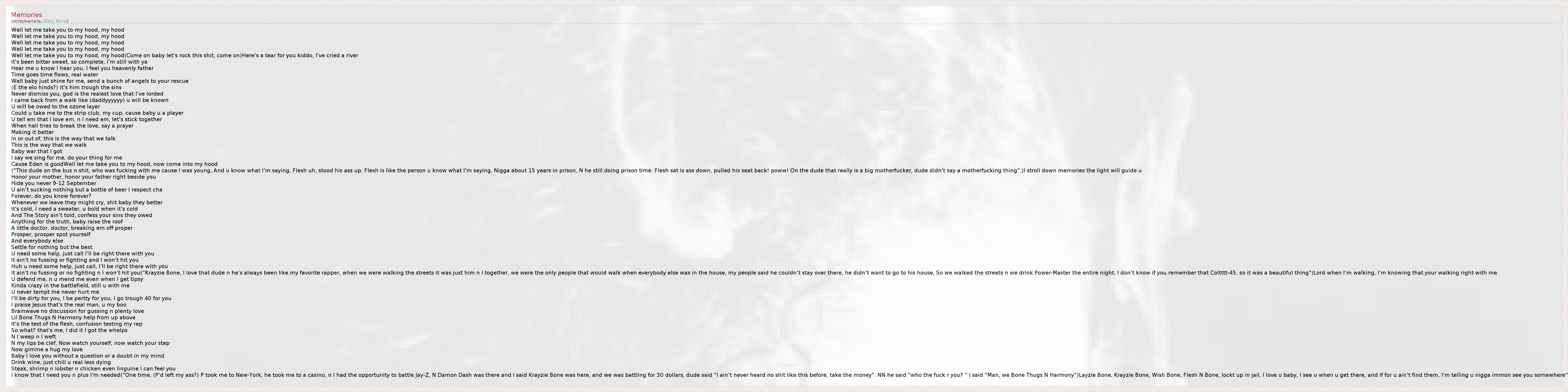 ("This dude on the bus n shit, who was fucking with me cause I was young, And u know what I'm saying, Flesh uh, stood his ass up, Flesh is like the person u know what I'm saying, Nigga about 15 years in prison, N he still doing prison time. Flesh sat is ass down, pulled his seat back! poww! On the dude that really is a big motherfucker, dude didn't say a motherfucking thing".)I stroll down memories the light will guide u